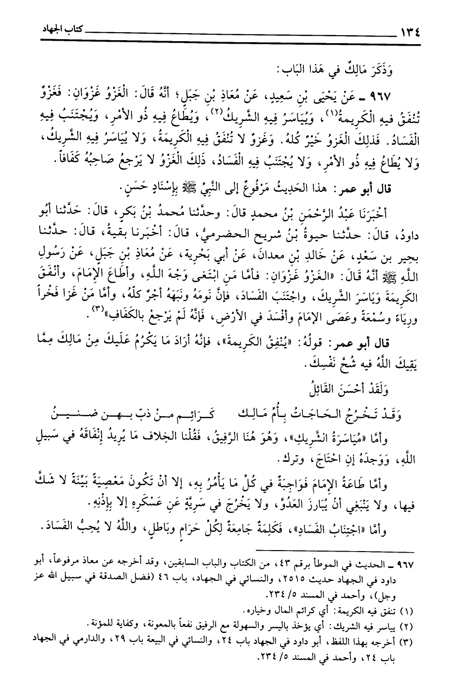967 - عَنْ يَحْيَى بْنِ سَعِيدٍ عَنْ مُعَاذِ بْنِ جَبَلٍ أَنَّهُ قَالَ الْغَزْوُ غَزْوَانِ فَغَزْوٌ تُنْفَقُ فِيهِ الْكَرِيمَةُ وَيُيَاسَرُ فِيهِ الشَّرِيكُ وَيُطَاعُ فِيهِ ذُو الْأَمْرِ وَيُجْتَنَبُ فِيهِ الْفَسَادُ فَذَلِكَ الْغَزْوُ خَيْرٌ كُلُّهُ وَغَزْوٌ لَا تُنْفَقُ فِيهِ الْكَرِيمَةُ وَلَا يُيَاسَرُ فِيهِ الشَّرِيكُ وَلَا يُطَاعُ فِيهِ ذُو الْأَمْرِ وَلَا يُجْتَنَبُ فِيهِ الْفَسَادُ ذَلِكَ الْغَزْوُ لَا يَرْجِعُ صَاحِبُهُ كَفَافًا