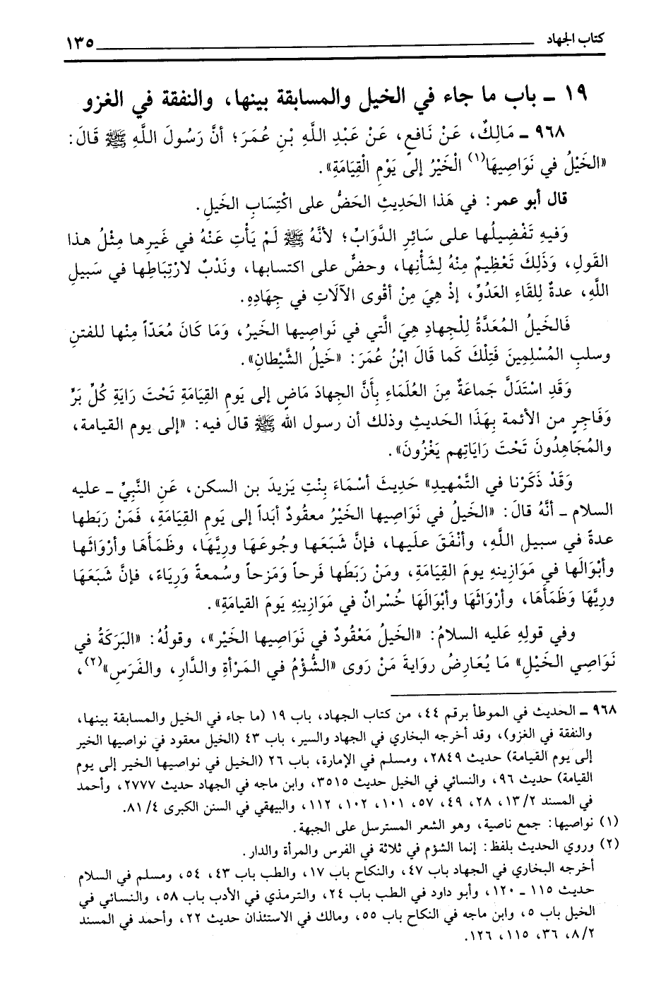 968 - مَالِكٌ عَنْ نَافِعٍ عَنْ عَبْدِ اللَّهِ بْنِ عُمَرَ أَنَّ رَسُولَ اللَّهِ صَلَّى اللَّهُ عَلَيْهِ وَسَلَّمَ قَالَ ((الْخَيْلُ فِي نَوَاصِيهَا (1) الْخَيْرُ إِلَى يَوْمِ الْقِيَامَةِ))