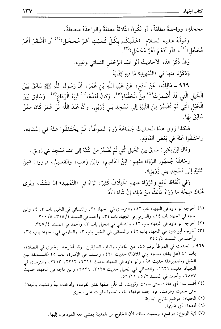 969 - مَالِكٌ عَنْ نَافِعٍ عَنْ عَبْدِ اللَّهِ بْنِ عُمَرَ أَنَّ رَسُولَ اللَّهِ صَلَّى اللَّهُ عَلَيْهِ وسلم سَابَقَ بَيْنَ الْخَيْلِ الَّتِي قَدْ أُضْمِرَتْ مِنَ الْحَفْيَاءِ وَكَانَ أَمَدُهَا ثَنِيَّةَ الْوَدَاعِ وَسَابَقَ بَيْنَ الْخَيْلِ الَّتِي لَمْ تُضَمَّرْ مِنَ الثَّنِيَّةِ إِلَى مَسْجِدِ بَنِي زُرَيْقٍ وَأَنَّ عَبْدَ اللَّهِ بْنَ عُمَرَ كَانَ مِمَّنْ سَابَقَ بِهَا
