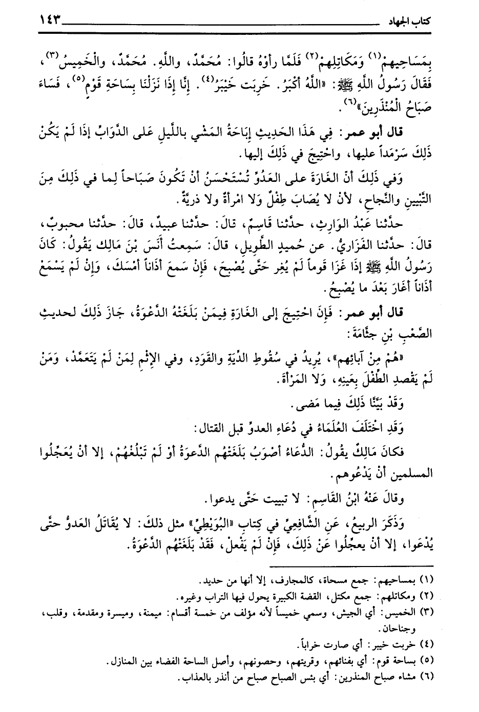 وَفِي ذَلِكَ أَنَّ الْغَارَةَ عَلَى الْعَدُوِّ تُسْتَحْسَنُ أَنْ تَكُونَ صَبَاحًا لِمَا فِي ذَلِكَ مِنَ التبيين والنجاح لأن لا يُصَابَ طِفْلٌ وَلَا امْرَأَةٌ وَلَا ذُرِّيَّةٌ