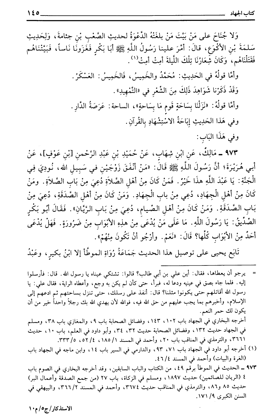 973 - مالك عن بن شِهَابٍ عَنْ حُمَيْدِ بْنِ عَبْدِ الرَّحْمَنِ بْنِ عَوْفٍ عَنْ أَبِي هُرَيْرَةَ أَنَّ رَسُولَ اللَّهِ صَلَّى اللَّهُ عَلَيْهِ وَسَلَّمَ قَالَ ((مَنْ أَنْفَقَ زَوْجَيْنِ فِي سَبِيلِ اللَّهِ نُودِيَ فِي الْجَنَّةِ يَا عَبْدَ اللَّهِ هَذَا خَيْرٌ فَمَنْ كَانَ مِنْ أَهْلِ الصَّلَاةِ دُعِيَ مِنْ بَابِ الصَّلَاةِ وَمَنْ كَانَ مِنْ أَهْلِ الْجِهَادِ دُعِيَ مِنْ بَابِ الْجِهَادِ وَمَنْ كَانَ مِنْ أَهْلِ الصَّدَقَةِ دُعِيَ مِنْ بَابِ الصَّدَقَةِ وَمَنْ كَانَ مِنْ أَهْلِ الصِّيَامِ دُعِيَ مِنْ بَابِ الرَّيَّانِ)) فَقَالَ أَبُو بَكْرٍ الصِّدِّيقُ يَا رَسُولَ اللَّهِ مَا عَلَى مَنْ يُدْعَى مِنْ هَذِهِ الْأَبْوَابِ مِنْ ضَرُورَةٍ فَهَلْ يُدْعَى أَحَدٌ مِنَ الْأَبْوَابِ كُلِّهَا قَالَ ((نَعَمْ وَأَرْجُو أَنْ تَكُونَ مِنْهُمْ))