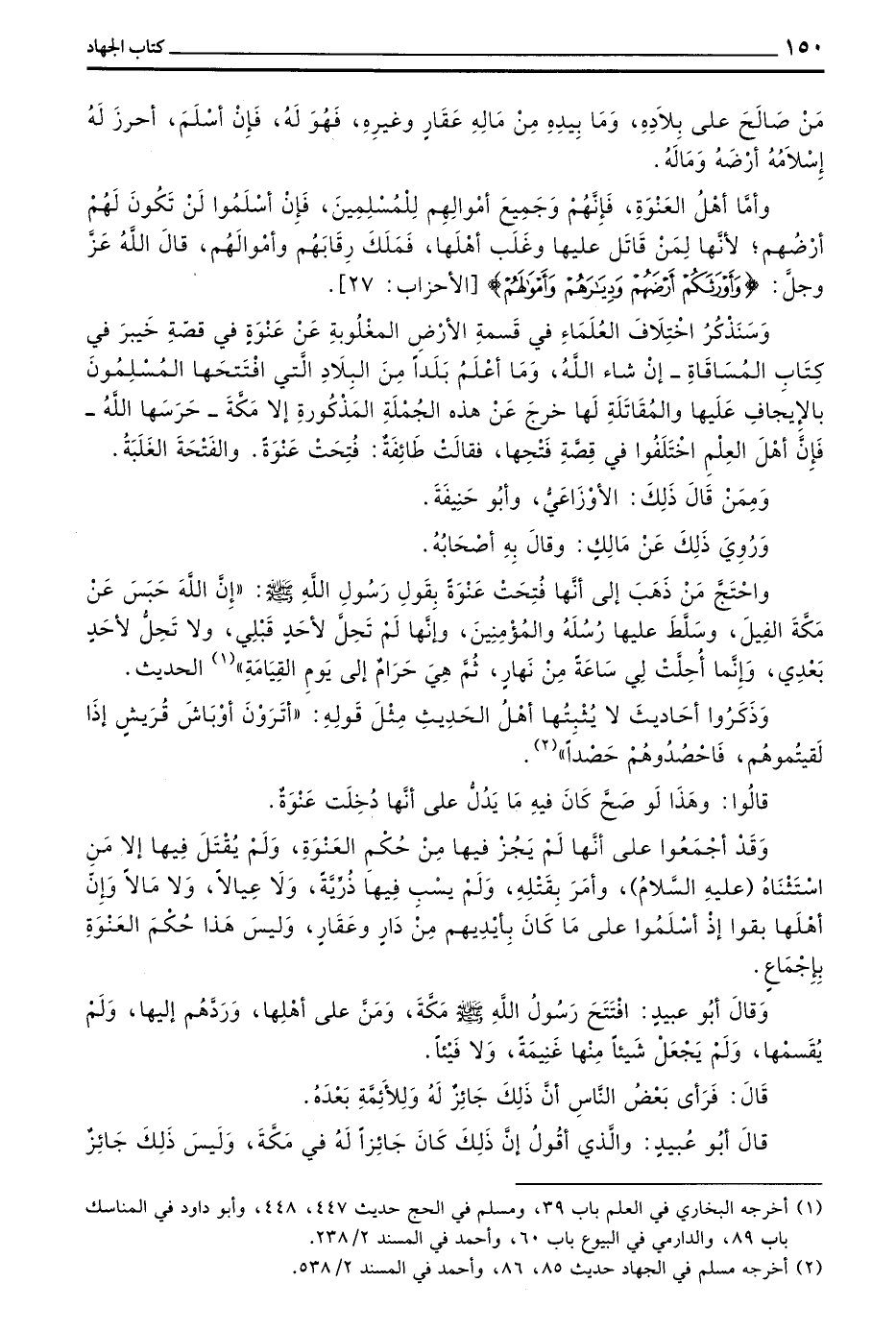 وَقَالَ أَبُو عُبَيْدٍ افْتَتَحَ رَسُولُ اللَّهِ صَلَّى اللَّهُ عَلَيْهِ وَسَلَّمَ مَكَّةَ وَمَنَّ عَلَى أَهْلِهَا وَرَدَّهُمْ إِلَيْهَا وَلَمْ يُقَسِّمْهَا وَلَمْ يَجْعَلْ شَيْئًا مِنْهَا غَنِيمَةً وَلَا فَيْئًا