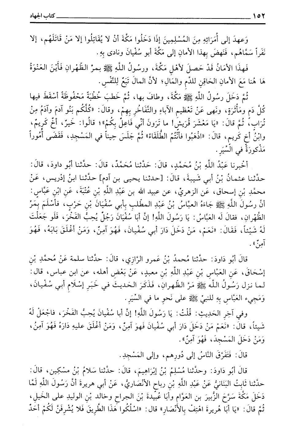 أَخْبَرَنَا عَبْدُ اللَّهِ بْنُ مُحَمَّدٍ قَالَ حَدَّثَنَا مُحَمَّدٌ قَالَ حَدَّثَنَا أَبُو دَاوُدَ قَالَ حَدَّثَنَا عُثْمَانُ بْنُ أَبِي شَيْبَةَ قَالَ حَدَّثَنَا يَحْيَى بْنُ آدم حدثنا بْنُ إِدْرِيسَ عَنْ مُحَمَّدِ بْنِ إِسْحَاقَ عَنِ الزُّهْرِيِّ عَنِ عَبِيدِ اللَّهِ بْنِ عَبْدِ اللَّهِ بْنِ عُتْبَةَ عن بْنِ عَبَّاسٍ أَنَّ رَسُولَ اللَّهِ صَلَّى اللَّهُ عَلَيْهِ وَسَلَّمَ جَاءَهُ الْعَبَّاسُ بْنُ عَبْدِ الْمُطَّلِبِ بِأَبِي سُفْيَانَ بْنِ حَرْبٍ فَأَسْلَمَ بِمَرِّ الظَّهْرَانِ فَقَالَ لَهُ الْعَبَّاسُ يَا رَسُولَ اللَّهِ! إِنَّ أَبَا سُفْيَانَ رَجُلٌ يُحِبُّ الْفَخْرَ فَلَوْ جَعَلْتَ لَهُ شَيْئًا فَقَالَ ((نَعَمْ مَنْ دَخَلَ دَارَ أَبِي سُفْيَانَ فَهُوَ آمِنٌ وَمَنْ أَغْلَقَ بَابَهُ فَهُوَ آمِنٌ))