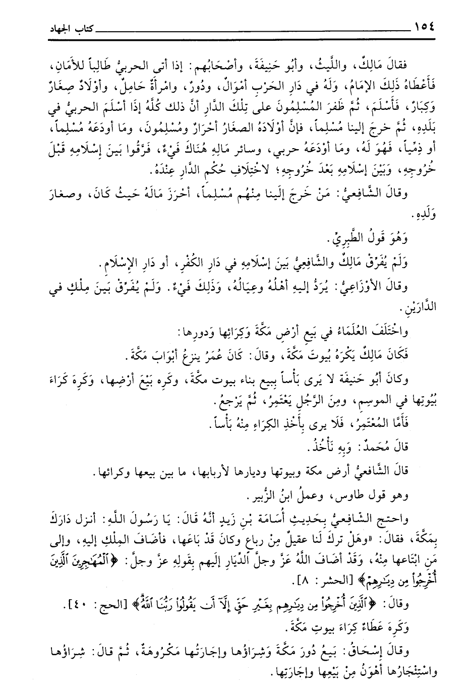 وَاحْتَجَّ الشَّافِعِيُّ بِحَدِيثِ أُسَامَةَ بْنِ زَيْدٍ أَنَّهُ قَالَ يَا رَسُولَ اللَّهِ أَنْزِلُ دَارَكَ بِمَكَّةَ فَقَالَ ((وَهَلْ تَرَكَ لَنَا عَقِيلٌ مِنْ رِبَاعٍ وَكَانَ قَدْ بَاعَهَا فَأَضَافَ الْمِلْكَ إِلَيْهِ وَإِلَى مَنِ ابْتَاعَهَا مِنْهُ وَقَدْ أَضَافَ اللَّهُ عَزَّ وَجَلَّ الدِّيَارَ إِلَيْهِمْ بِقَوْلِهِ عَزَّ وَجَلَّ (الْمُهَاجِرِينَ الَّذِينَ أُخْرِجُوا مِنْ دِيارِهِمْ) الْحَشْرِ 8