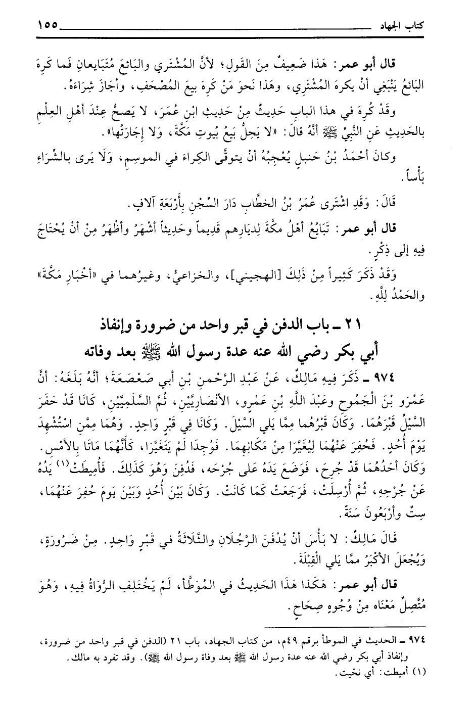 974 - ذَكَرَ فِيهِ مَالِكٌ عَنْ عَبْدِ الرَّحْمَنِ بْنِ أَبِي صَعْصَعَةَ أَنَّهُ بَلَغَهُ أَنَّ عَمْرَو بن الجموح وعبد الله بن عمرو الأنصاريين ثُمَّ السَّلَمِيَّيْنِ كَانَا قَدْ حَفَرَ السَّيْلُ قَبْرَهُمَا وَكَانَ قَبْرُهُمَا مِمَّا يَلِي السَّيْلَ وَكَانَا فِي قَبْرٍ وَاحِدٍ وَهَمَّا مِمَّنِ اسْتُشْهِدَ يَوْمَ أُحُدٍ فَحُفِرَ عَنْهُمَا لِيُغَيَّرَا مِنْ مَكَانِهِمَا فَوُجِدَا لَمْ يَتَغَيَّرَا كَأَنَّهُمَا مَاتَا بِالْأَمْسِ وَكَانَ أَحَدُهُمَا قَدْ جُرِحَ فَوَضَعَ يَدَهُ عَلَى جُرْحِهِ فَدُفِنَ وَهُوَ كَذَلِكَ فَأُمِيطَتْ يَدُهُ عَنْ جُرْحِهِ ثُمَّ أُرْسِلَتْ فَرَجَعَتْ كَمَا كَانَتْ وَكَانَ بَيْنَ أُحُدٍ وَبَيْنَ يَوْمِ حُفِرَ عَنْهُمَا سِتٌّ وَأَرْبَعُونَ سَنَةً