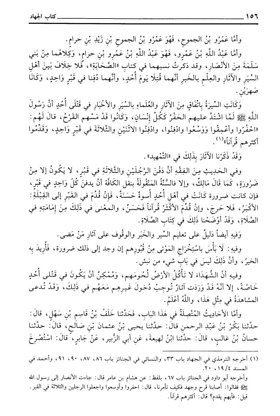 وَأَمَّا عَبْدُ اللَّهِ بْنُ عَمْرٍو فَهُوَ عَبْدُ اللَّهِ بْنُ عَمْرِو بْنِ حَرَامٍ وَكِلَاهُمَا مِنْ بَنِي سَلَمَةَ من الأنصار وقد ذكرت نسبها فِي كِتَابِ ((الصَّحَابَةِ)) فَلَا خِلَافَ بَيْنَ أَهْلِ السِّيَرِ وَالْآثَارِ وَالْعِلْمِ بِالْخَبَرِ أَنَّهُمَا قُتِلَا يَوْمَ أُحُدٍ وَأَنَّهُمَا دُفِنَا فِي قَبْرٍ وَاحِدٍ وَكَانَا صِهْرَيْنِ