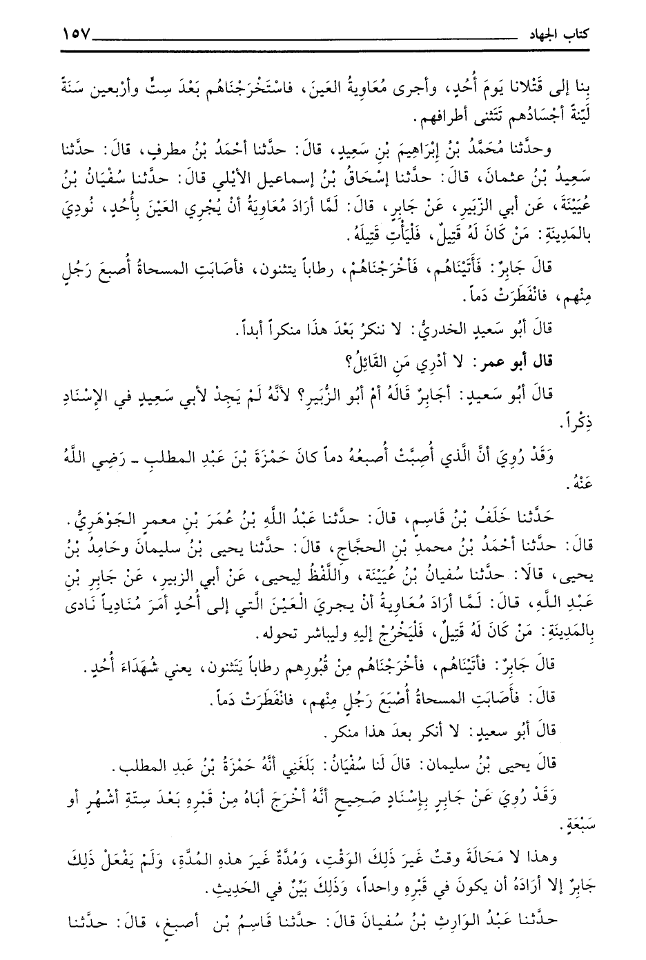 بِنَا إِلَى قَتْلَانَا يَوْمَ أُحُدٍ وَأَجْرَى مُعَاوِيَةُ الْعَيْنَ فَاسْتَخْرَجْنَاهُمْ بَعْدَ سِتٍّ وَأَرْبَعِينَ سَنَةً لَيِّنَةً أَجْسَادُهُمْ تَتَثَنَّى أَطْرَافُهُمْ