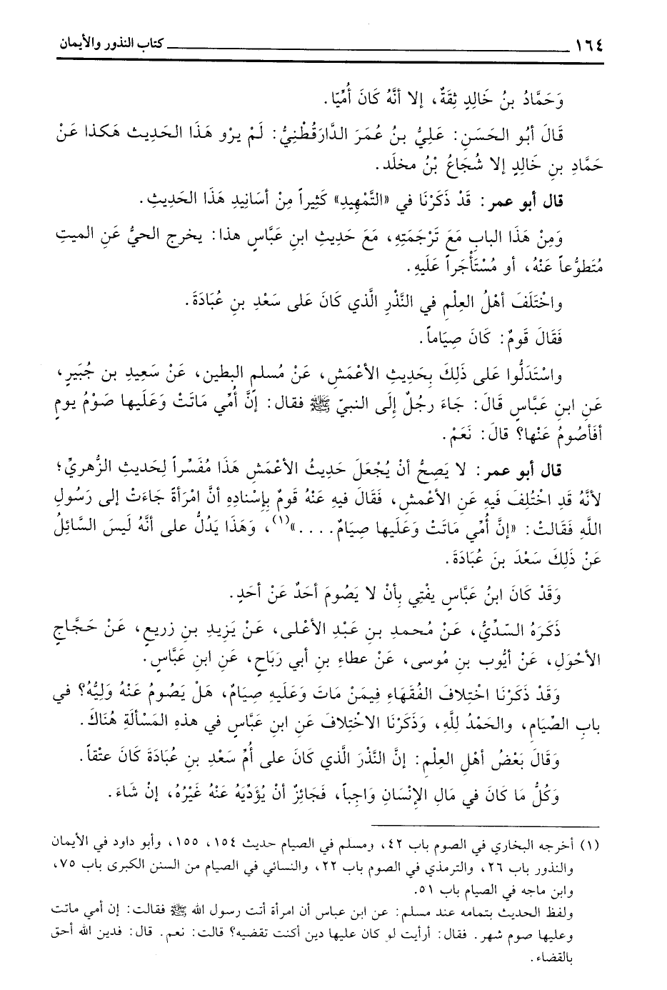 قَالَ أَبُو عُمَرَ لَا يَصِحُّ أَنْ يُجْعَلَ حَدِيثُ الْأَعْمَشِ هَذَا مُفَسِّرًا لِحَدِيثِ الزُّهْرِيِّ لِأَنَّهُ قَدِ اخْتُلِفَ فِيهِ عَنِ الْأَعْمَشِ فَقَالَ فِيهِ عَنْهُ قَوْمٌ بِإِسْنَادِهِ أَنَّ امْرَأَةً جَاءَتْ إِلَى رسول الله فَقَالَتْ ((إِنَّ أُمِّي مَاتَتْ وَعَلَيْهَا صِيَامٌ)) وَهَذَا يَدُلُّ عَلَى أَنَّهُ لَيْسَ السَّائِلُ عَنْ ذَلِكَ سعد بن عبادة