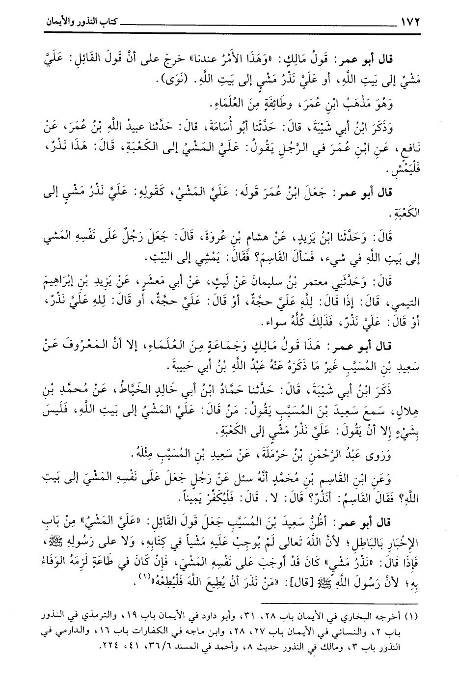 قَالَ أَبُو عُمَرَ قَوْلُ مَالِكٍ ((وَهَذَا الْأَمْرُ عِنْدَنَا)) خَرَجَ عَلَى أَنَّ قَوْلَ الْقَائِلِ عَلَيَّ مَشْيٌ إِلَى بَيْتِ اللَّهِ أَوْ عَلَيَّ نَذْرُ مَشْيٍ إِلَى بَيْتِ اللَّهِ (نَوَى)