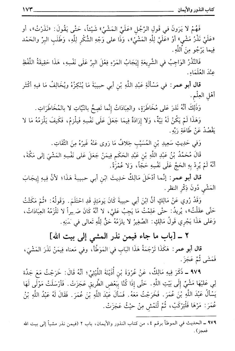 فَهُمْ لَا يَرَوْنَ فِي قَوْلِ الرَّجُلِ ((عَلَيَّ الْمَشْيُ)) شَيْئًا حَتَّى يَقُولَ ((نَذَرْتُ)) أَوْ ((عَلَيَّ نَذْرُ مَشْيٍ)) أَوْ ((عَلَيَّ لِلَّهِ الْمَشْيُ)) وَذَا عَلَى وَجْهِ الشُّكْرِ لِلَّهِ وَطَلَبِ الْبِرِّ وَالْحَمْدِ فِيمَا يَرْجُو مِنَ اللَّهِ
