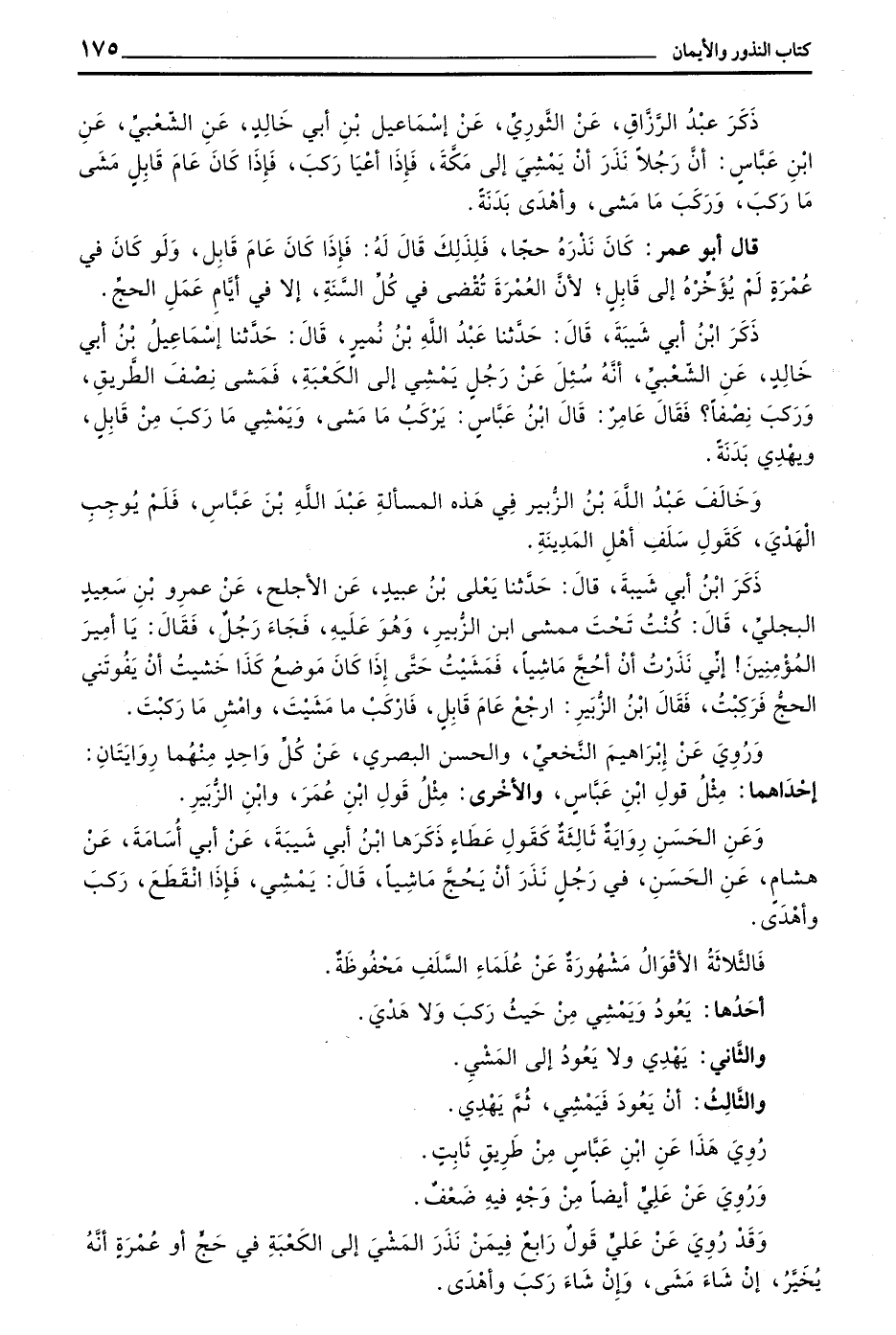 ذَكَرَ عَبْدُ الرَّزَّاقِ عَنِ الثَّوْرِيِّ عَنْ إِسْمَاعِيلَ بْنِ أَبِي خَالِدٍ عَنِ الشعبي عن بن عَبَّاسٍ أَنَّ رَجُلًا نَذَرَ أَنْ يَمْشِيَ إِلَى مكة فإذا أَعْيَا رَكِبَ فَإِذَا كَانَ عَامَ قَابِلٍ مَشَى مَا رَكِبَ وَرَكِبَ مَا مَشَى وَأَهْدَى بَدَنَةً