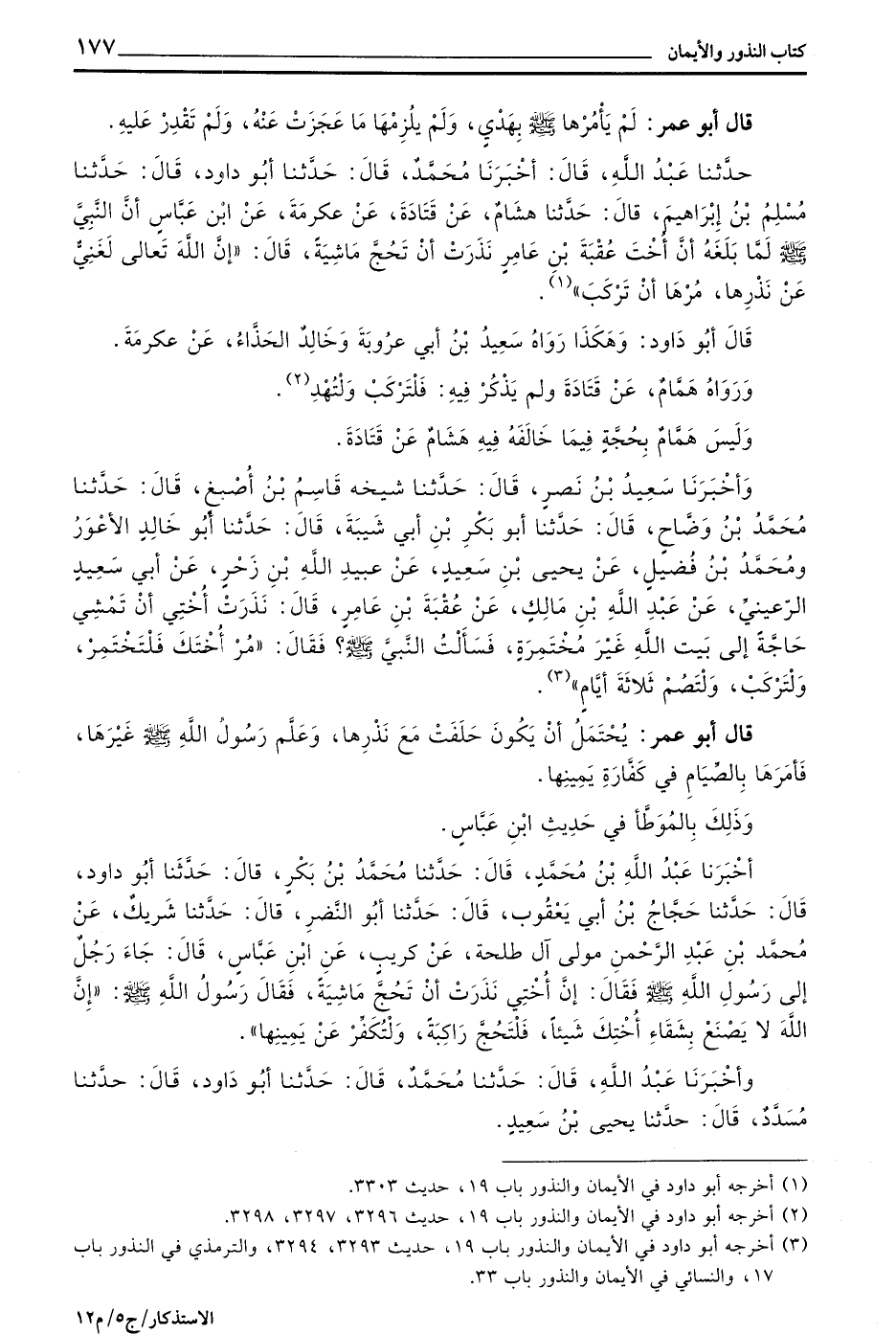 وَأَخْبَرَنَا سَعِيدُ بْنُ نَصْرٍ قَالَ حَدَّثَنَا شَيْخُهُ قَاسِمُ بْنُ أَصْبَغَ قَالَ حَدَّثَنَا مُحَمَّدُ بْنُ وَضَّاحٍ قَالَ حَدَّثَنَا أَبُو بَكْرِ بْنُ أَبِي شَيْبَةَ قَالَ حَدَّثَنَا أَبُو خَالِدٍ الْأَعْوَرُ وَمُحَمَّدُ بْنُ فُضَيْلٍ عَنْ يَحْيَى بْنِ سَعِيدٍ عَنِ عُبَيْدِ اللَّهِ بْنِ زَحْرٍ عَنْ أَبِي سَعِيدٍ الرُّعَيْنِيِّ عَنْ عَبْدِ اللَّهِ بْنِ مَالِكٍ عَنْ عُقْبَةَ بْنِ عَامِرٍ قَالَ نَذَرَتْ أُخْتِي أَنْ تَمْشِيَ حَاجَّةً إِلَى بَيْتِ اللَّهِ غَيْرَ مُخْتَمِرَةٍ فَسَأَلْتُ النَّبِيَّ صَلَّى اللَّهُ عَلَيْهِ وَسَلَّمَ فَقَالَ ((مُرْ أُخْتَكَ فَلْتَخْتَمِرْ وَلْتَرْكَبْ وَلْتَصُمْ ثَلَاثَةَ أَيَّامٍ))