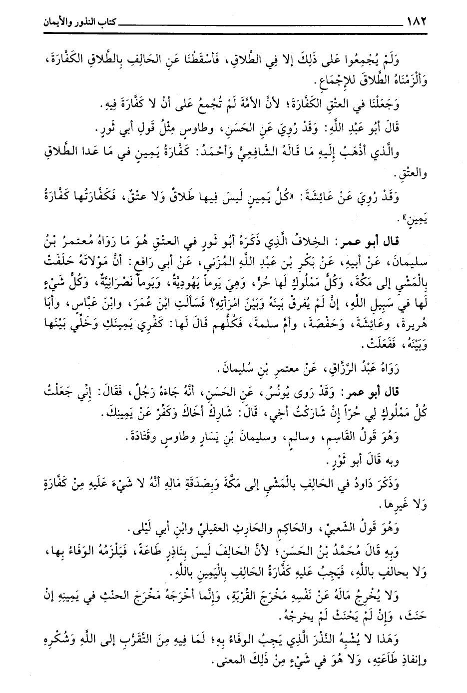 قَالَ أَبُو عُمَرَ الْخِلَافُ الَّذِي ذَكَرَهُ أَبُو ثَوْرٍ فِي الْعِتْقِ هُوَ مَا رَوَاهُ مُعْتَمِرُ بْنُ سُلَيْمَانَ عَنْ أَبِيهِ عن بكر بن عبد الله المزني عن أَبِي رَافِعٍ أَنَّ مَوْلَاتَهُ حَلَفَتْ بِالْمَشْيِ إِلَى مَكَّةَ وَكُلُّ مَمْلُوكٍ لَهَا حُرٌّ وَهِيَ يَوْمًا يَهُودِيَّةٌ وَيَوْمًا نَصْرَانِيَّةٌ وَكُلُّ شَيْءٍ لَهَا فِي سَبِيلِ اللَّهِ إِنْ لَمْ يُفَرِّقْ بَيْنَهُ وَبَيْنَ امرأته فسألت بن عمر وبن عَبَّاسٍ وَأَبَا هُرَيْرَةَ وَعَائِشَةَ وَحَفْصَةَ وَأُمَّ سَلَمَةَ فَكُلُّهُمْ قَالَ لَهَا كَفِّرِي يَمِينَكِ وَخَلِّي بَيْنَهَا وَبَيْنَهُ فَفَعَلَتْ