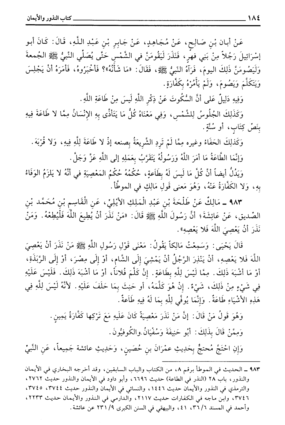 983 - مَالِكٌ عَنْ طِلْحَةَ بْنِ عَبْدِ الْمَلِكِ الْأَيْلِيٌ عَنِ الْقَاسِمِ بْنِ مُحَمَّدِ بْنِ الصَّدِّيقِ عَنْ عَائِشَةَ أَنَّ رَسُولَ اللَّهِ صَلَّى اللَّهُ عَلَيْهِ وَسَلَّمَ قَالَ ((مَنْ نَذَرَ أَنْ يطيع الله فليطعه ومن نذر أن يعصي الله فلا يعصه يحيى))