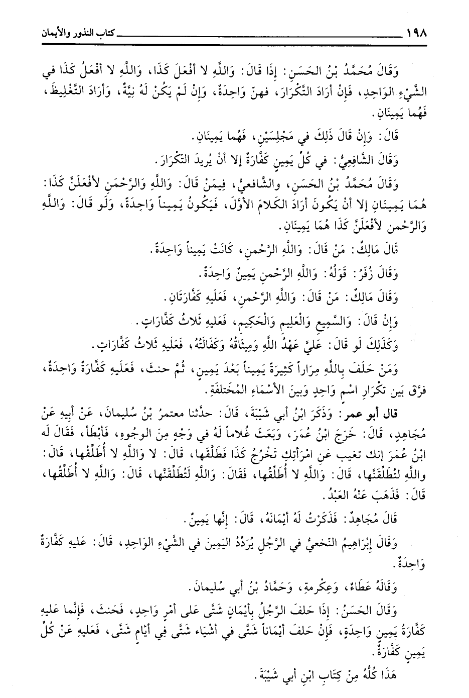 وَقَالَ إِبْرَاهِيمُ النَّخَعِيُّ فِي الرَّجُلِ يُرَدِّدُ الْيَمِينَ فِي الشَّيْءِ الْوَاحِدِ قَالَ عَلَيْهِ كَفَّارَةٌ وَاحِدَةٌ
