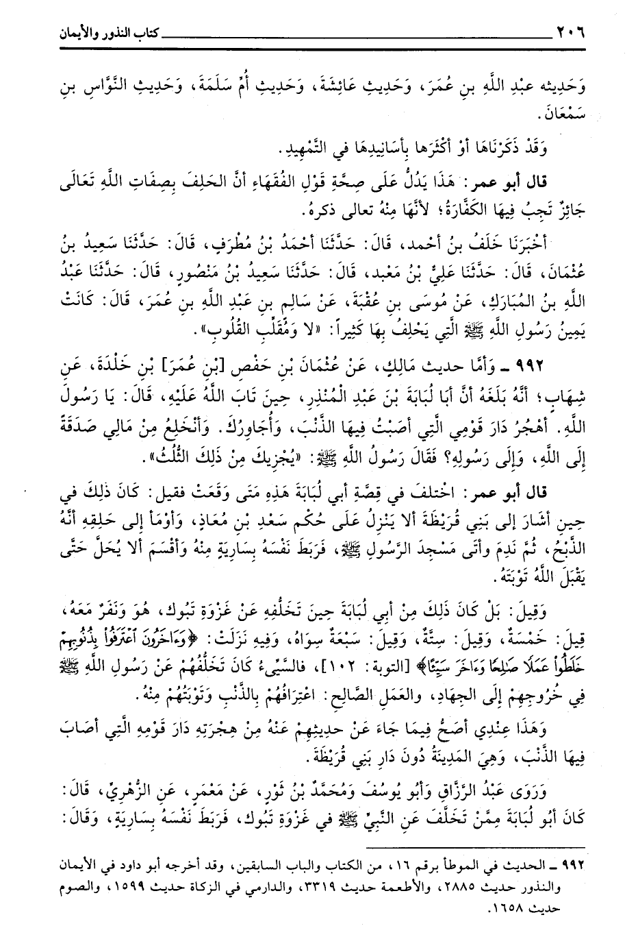 992 - وَأَمَّا حَدِيثُ مَالِكٍ عَنْ عُثْمَانَ بْنِ حفص بن عمر بن خلدة عن شِهَابٍ أَنَّهُ بَلَغَهُ أَنَّ أَبَا لُبَابَةَ بْنَ عَبْدِ الْمُنْذِرِ حِينَ تَابَ اللَّهُ عَلَيْهِ قَالَ يَا رَسُولَ اللَّهِ أَهْجُرُ دَارَ قَوْمِي الَّتِي أَصَبْتُ فِيهَا الذَّنْبَ وَأُجَاوِرُكَ وَأَنْخَلِعُ مِنْ مَالِي صَدَقَةً إِلَى اللَّهِ وَإِلَى رَسُولِهِ فَقَالَ رَسُولُ اللَّهِ صَلَّى اللَّهُ عَلَيْهِ وَسَلَّمَ ((يُجْزِيكَ مِنْ ذَلِكَ الثُّلُثُ))