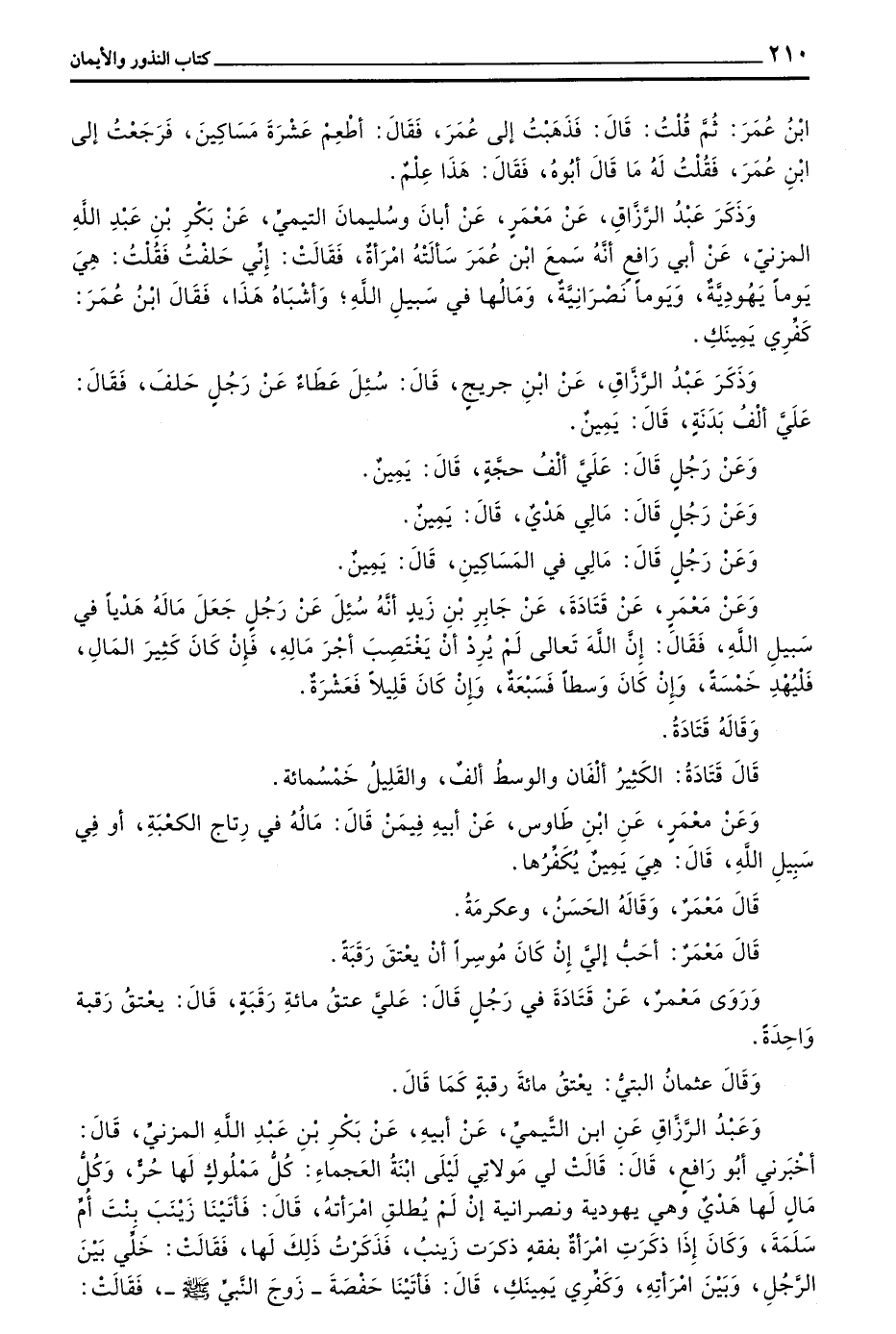 وَذَكَرَ عَبْدُ الرَّزَّاقِ عَنْ مَعْمَرٍ عَنْ أَبَانٍ وَسُلَيْمَانَ التَّيْمِيِّ عَنْ بَكْرِ بْنِ عَبْدِ اللَّهِ الْمُزَنِيِّ عَنْ أَبِي رَافِعٍ أَنَّهُ سمع بن عُمَرَ سَأَلَتْهُ امْرَأَةٌ فَقَالَتْ إِنِّي حَلَفْتُ فَقُلْتُ هِيَ يَوْمًا يَهُودِيَّةٌ وَيَوْمًا نَصْرَانِيَّةٌ وَمَالُهَا فِي سبيل الله وأشباه هذا فقال بن عُمَرَ كَفِّرِي يَمِينَكِ
