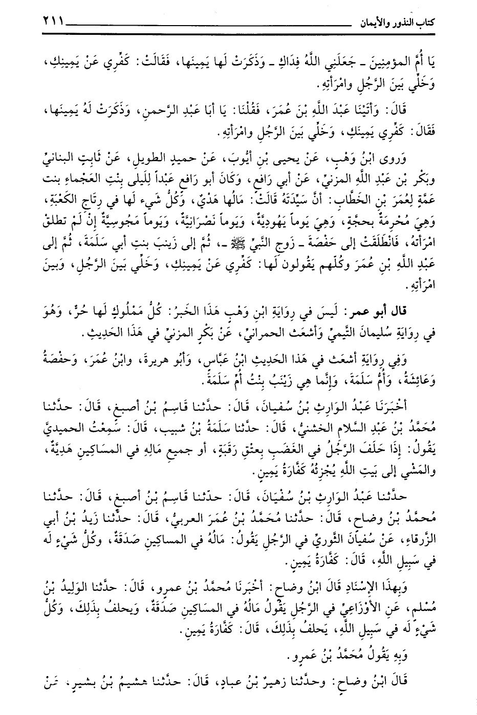 حَدَّثَنَا عَبْدُ الْوَارِثِ بْنُ سُفْيَانَ قَالَ حَدَّثَنَا قَاسِمُ بْنُ أَصْبَغَ قَالَ حَدَّثَنَا مُحَمَّدُ بْنُ وَضَّاحٍ قَالَ حَدَّثَنَا مُحَمَّدُ بْنُ عُمَرَ الْعَرَبِيُّ قَالَ حَدَّثَنَا زَيْدُ بْنُ أَبِي الزَّرْقَاءِ عَنْ سُفْيَانَ الثَّوْرِيِّ فِي الرَّجُلِ يَقُولُ مَالُهُ فِي الْمَسَاكِينِ صَدَقَةٌ وَكُلُّ شَيْءٍ لَهُ فِي سَبِيلِ اللَّهِ قَالَ كَفَّارَةُ يَمِينٍ