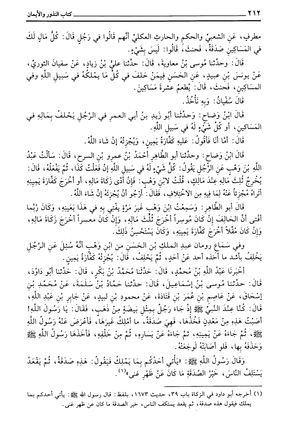 قال بن وضاح وحدثنا أبوالطاهر أَحْمَدُ بْنُ عَمْرِو بْنِ السَّرْحِ قَالَ سَأَلَتْ عَبْدَ اللَّهِ بْنَ وَهْبٍ عَنِ الرَّجُلِ يَقُولُ كُلُّ شَيْءٍ لَهُ فِي سَبِيلِ اللَّهِ إِنْ فَعُلْتُ كَذَا ثُمَّ يَفْعَلُهُ قَالَ يُخْرِجُ ثُلُثَ مَالِهِ عِنْدَ مَالِكٍ قُلْتُ لِابْنِ وَهْبٍ فَإِنْ أدى زَكَاةَ مَالِهِ أَوْ أَخْرَجَ كَفَّارَةَ يَمِينِهِ أَتَرَاهٍ مُجْزِئًا عَنْهُ لِمَا فِيهِ مِنَ الِاخْتِلَافِ فَقَالَ أَرْجُو أَنْ يُجْزِئَهُ إِنْ شَاءَ اللَّهُ