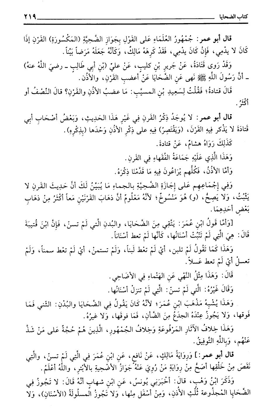 وَقَدْ رَوَى قَتَادَةُ عَنْ جَرِيرِ بْنِ كُلَيْبٍ عَنْ عَلِيِّ (بْنِ أَبِي طَالِبٍ - رَضِيَ اللَّهُ عَنْهُ) - أَنَّ رَسُولَ اللَّهِ صَلَّى اللَّهُ عَلَيْهِ وسلم نهى عن الضحايا عن أعضب الأذن والقرن