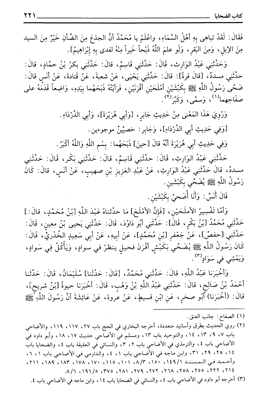 وأما تفسير الأملحين فإن الأملح مَا حَدَّثَنَاهُ عَبْدُ اللَّهِ بْنُ مُحَمَّدٍ قَالَ حَدَّثَنِي مُحَمَّدُ بْنُ بَكْرٍ قَالَ حَدَّثَنِي أَبُو دَاوُدَ قَالَ حَدَّثَنِي يَحْيَى بْنُ مَعِينٍ قَالَ حَدَّثَنِي حَفْصٌ عَنْ جَعْفَرِ بْنِ مُحَمَّدٍ عَنْ أَبِيهِ عَنْ أَبِي سَعِيدٍ الْخُدْرِيِّ قَالَ كَانَ رَسُولُ اللَّهِ صَلَّى اللَّهُ عَلَيْهِ وَسَلَّمَ يُضَحِّي بِكَبْشٍ أَقْرَنَ فَحِيلٍ يَنْظُرُ فِي سَوَادٍ وَيَأْكُلُ فِي سَوَادٍ وَيَمْشِي فِي سَوَادٍ