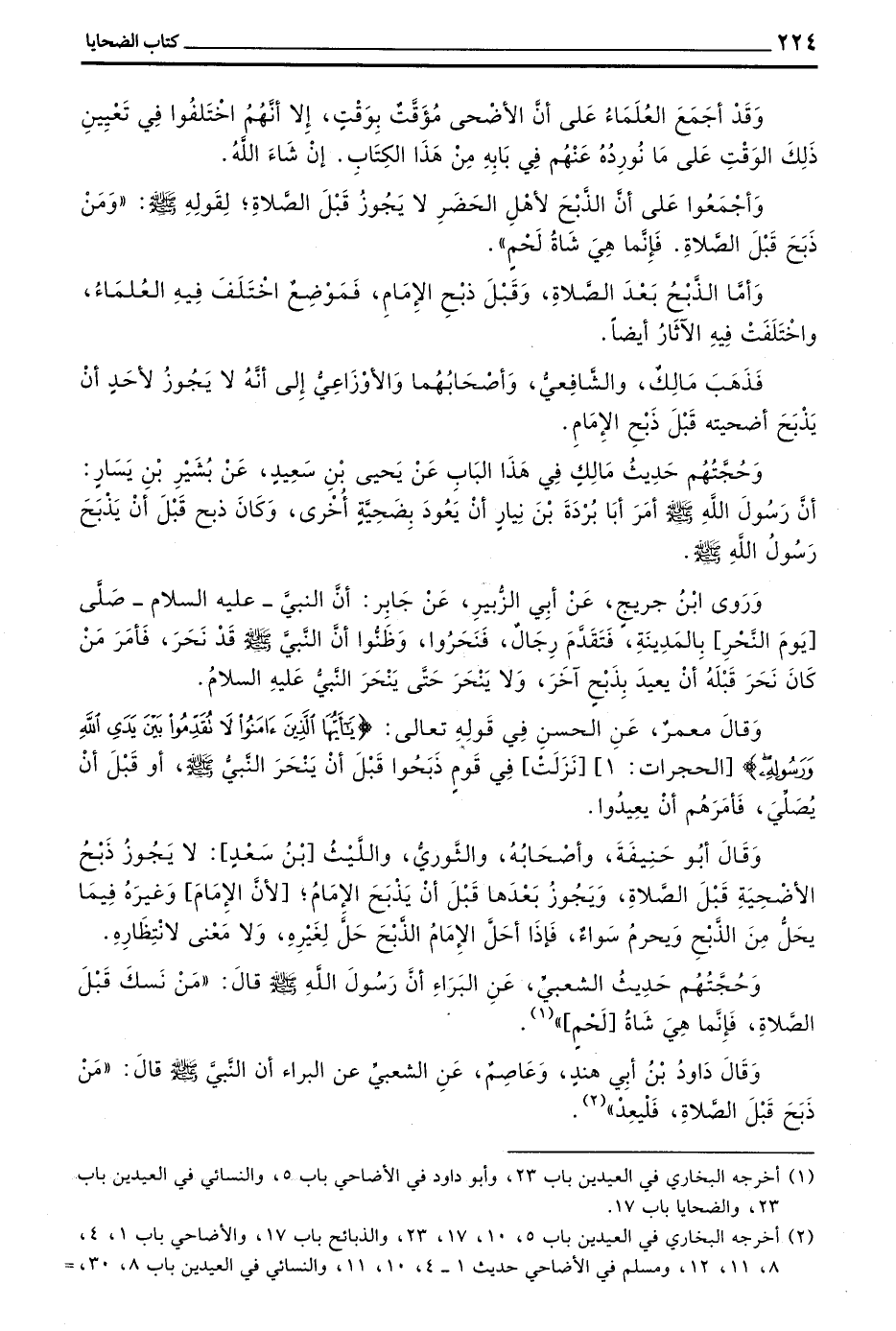 وَأَجْمَعُوا عَلَى أَنَّ الذَّبْحَ لِأَهْلِ الْحَضَرِ لَا يَجُوزُ قَبْلَ الصَّلَاةِ لِقَوْلِهِ صَلَّى اللَّهُ عَلَيْهِ وَسَلَّمَ ((وَمَنْ ذَبَحَ قَبْلَ الصَّلَاةِ فَإِنَّمَا هِيَ شَاةُ لَحْمٍ))