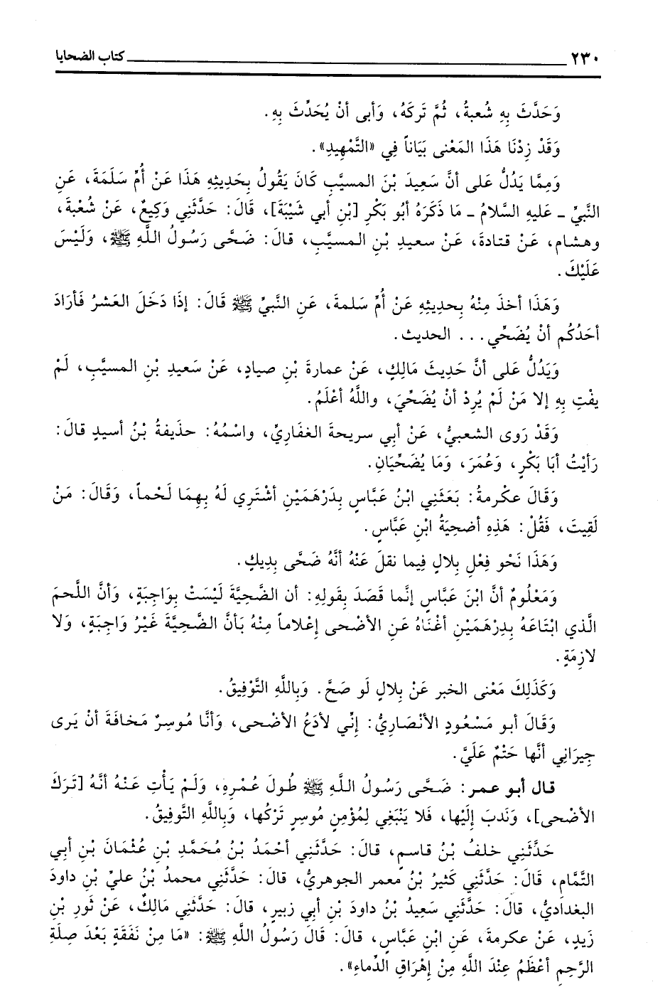 قَالَ أَبُو عُمَرَ ضَحَّى رَسُولُ اللَّهِ صَلَّى اللَّهُ عَلَيْهِ وَسَلَّمَ طُولَ عُمْرِهِ وَلَمْ يَأْتِ عَنْهُ أَنَّهُ تَرَكَ الْأَضْحَى وَنَدَبَ إِلَيْهَا فَلَا يَنْبَغِي لِمُؤْمِنٍ مُوسِرٍ تَرْكُهَا وَبِاللَّهِ التَوْفِيقُ