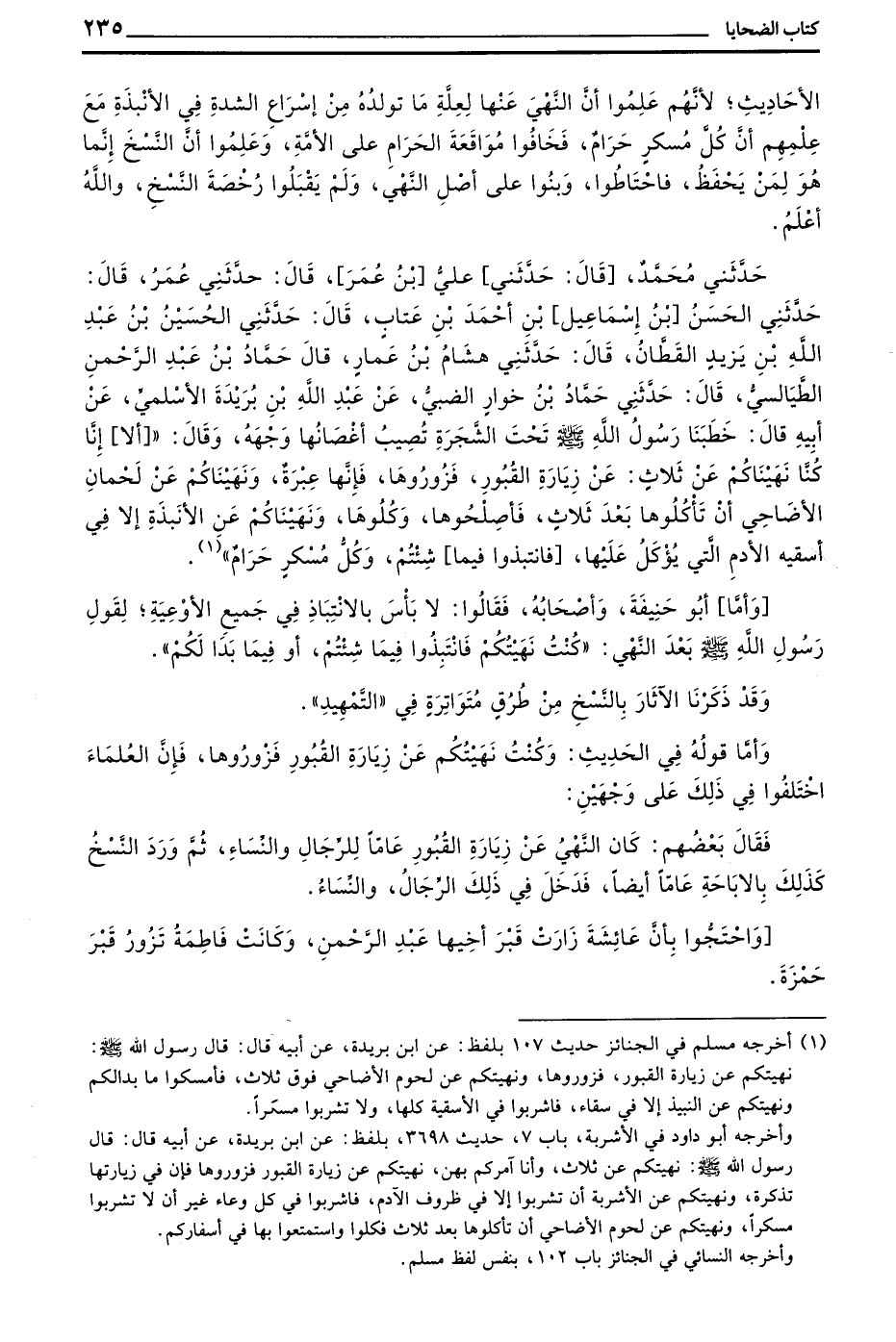 حَدَّثَنِي مُحَمَّدٌ قَالَ حَدَّثَنِي عَلِيُّ بْنُ عُمَرَ قَالَ حَدَّثَنِي عُمَرُ قَالَ حَدَّثَنِي الْحَسَنُ بْنُ إِسْمَاعِيلَ بْنِ أَحْمَدَ بْنِ عَتَّابٍ قَالَ حَدَّثَنِي الْحُسَيْنُ بْنُ عَبْدِ اللَّهِ بْنِ يَزِيدَ الْقَطَّانُ قَالَ حَدَّثَنِي هِشَامُ بْنُ عَمَّارٍ قَالَ حَمَّادُ بْنُ عَبْدِ الرَّحْمَنِ الطَّيَالِسِيُّ قَالَ حَدَّثَنِي حَمَّادُ بْنُ خُوَارٍ الضَّبِّيُّ عَنْ عَبْدِ اللَّهِ بْنِ بُرَيْدَةَ الْأَسْلَمِيِّ عَنْ أَبِيهِ قَالَ خَطَبَنَا رَسُولُ اللَّهِ صَلَّى اللَّهُ عَلَيْهِ وسلم تَحْتَ الشَّجَرَةِ تُصِيبُ أَغْصَانُهَا وَجْهَهُ وَقَالَ ((أَلَّا إِنَّا كُنَّا نَهَيْنَاكُمْ عَنْ ثَلَاثٍ عَنْ زِيَارَةِ الْقُبُورِ فَزُورُوهَا فَإِنَّهَا عِبْرَةٌ وَنَهَيْنَاكُمْ عَنْ لُحْمَانِ الْأَضَاحِي أَنْ تَأَكُلُوهَا بَعْدَ ثَلَاثٍ فَأَصْلِحُوهَا وَكُلُوهَا وَنَهَيْنَاكُمْ عَنِ الْأَنْبِذَةِ إِلَّا فِي أَسْقِيةِ الْأُدُمِ الَّتِي يُؤْكَلُ عَلَيْهَا فَانْتَبِذُوا فِيمَا شِئْتُمْ وَكُلُّ مُسْكِرٍ حَرَامٍ))