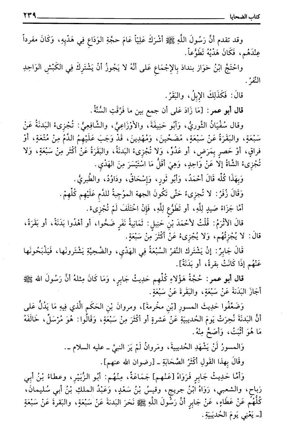 قَالَ أَبُو عُمَرَ حُجَّةُ هَؤُلَاءِ كُلُّهُمْ حَدِيثُ جَابِرٍ وَمَا كَانَ مِثْلَهُ أَنَّ رَسُولَ اللَّهِ صَلَّى اللَّهُ عَلَيْهِ وسلم أَجَازَ الْبَدَنَةَ عَنْ سَبْعَةٍ وَالْبَقَرَةَ عَنْ سَبْعَةٍ