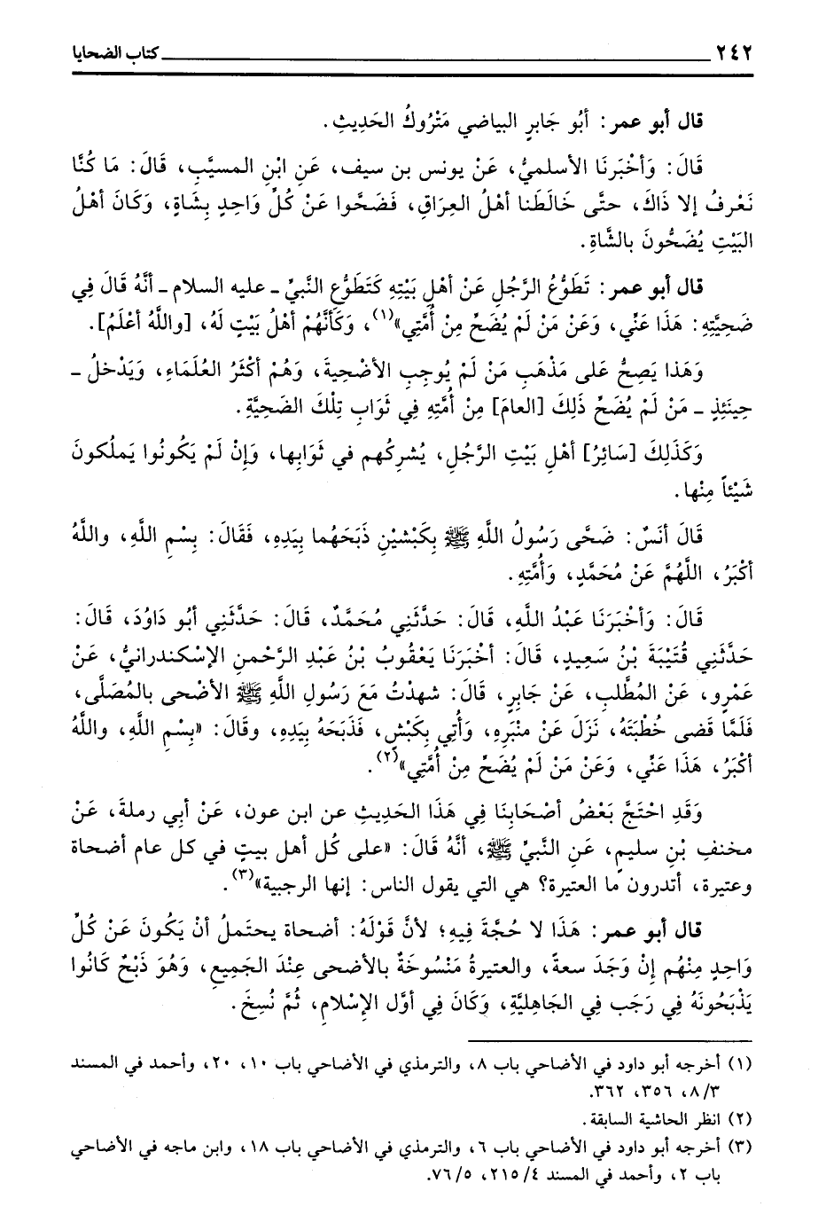 قَالَ أَبُو عُمَرَ هَذَا لَا حُجَّةَ فِيهِ لِأَنَّ قَوْلَهُ أَضْحَاةٌ يُحْتَمَلُ أَنْ يَكُونَ عَنْ كُلِّ وَاحِدٍ مِنْهُمْ إِنْ وَجَدَ سَعَةً وَالْعَتِيرَةُ مَنْسُوخَةٌ بِالْأَضْحَى عِنْدَ الْجَمِيعِ وَهُوَ ذَبْحٌ كَانُوا يَذْبَحُونَهُ فِي رَجَبٍ فِي الْجَاهِلِيَّةِ وَكَانَ فِي أَوَّلِ الْإِسْلَامِ ثُمَّ نُسِخَ