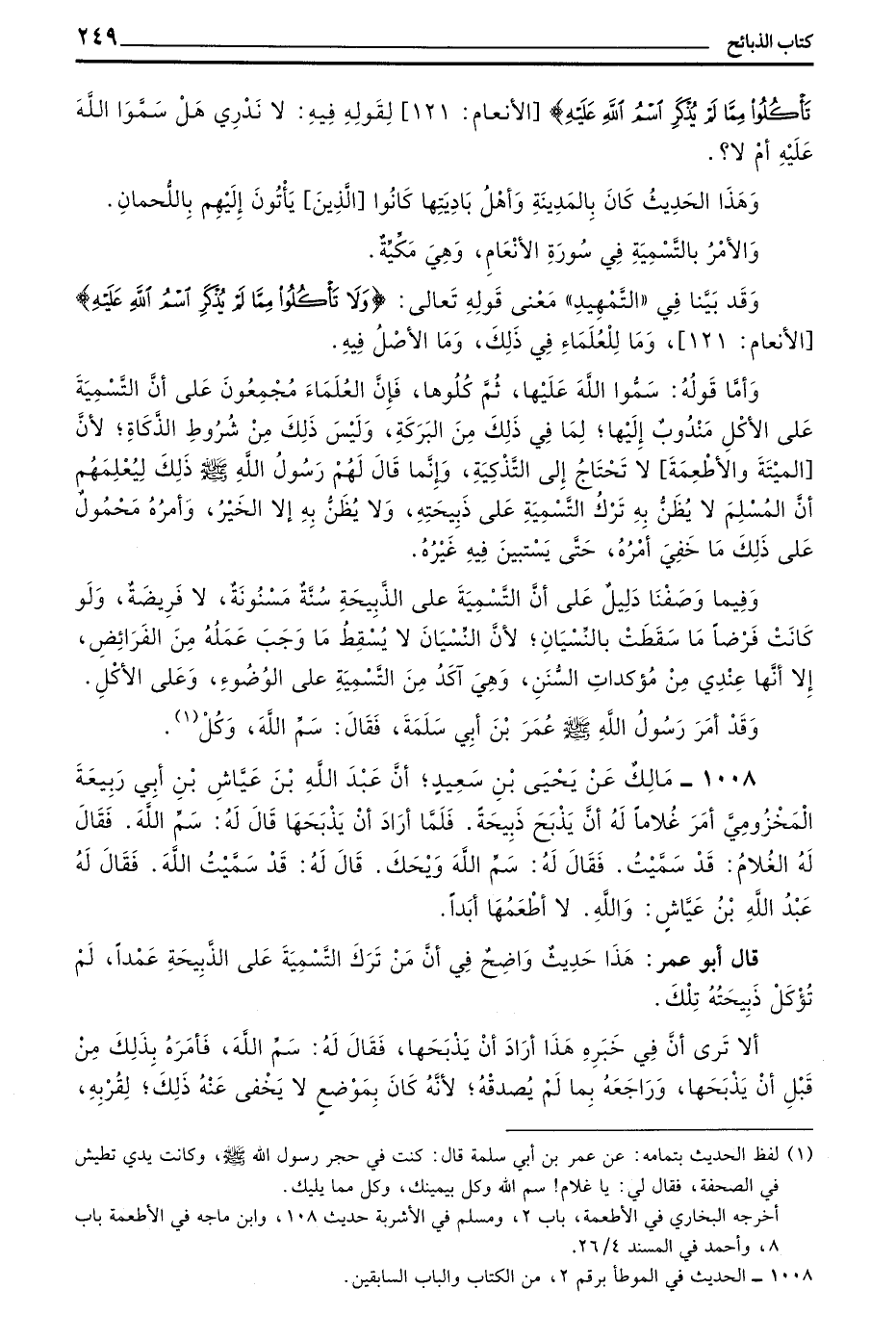 قَالَ أَبُو عُمَرَ هَذَا حَدِيثٌ وَاضِحٌ فِي أَنَّ مَنْ تَرَكَ التَّسْمِيَةَ عَلَى الذَّبِيحَةِ عَمْدًا لَمْ تُؤْكَلْ ذَبِيحَتُهُ تِلْكَ