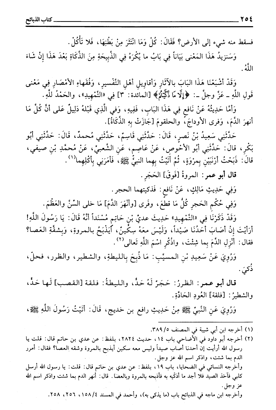 وَقَدْ أَشْبَعْنَا هَذَا الْبَابَ بِالْآثَارِ وَأَقَاوِيلِ أَهْلِ التَّفْسِيرِ وَفُقَهَاءِ الْأَمْصَارِ فِي مَعْنَى قَوْلِ اللَّهِ - عَزَّ وَجَلَّ - (إِلَّا مَا ذَكَّيْتُمْ) الْمَائِدَةِ 3 فِي ((التَّمْهِيدِ)) وَالْحَمْدُ لِلَّهِ