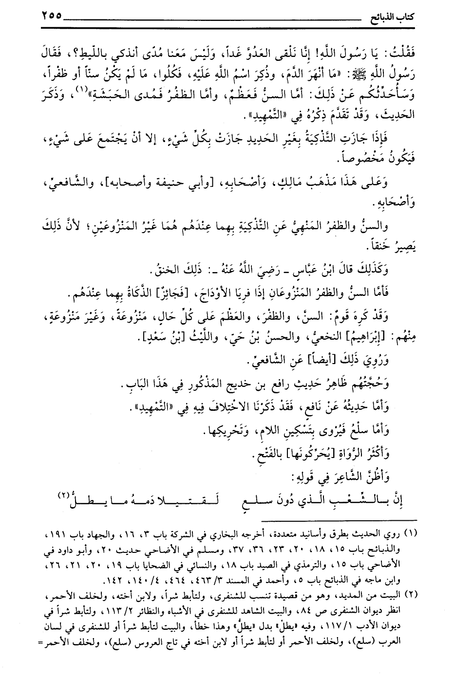 فَقُلْتُ يَا رَسُولَ اللَّهِ! إِنَّا نَلْقَى الْعَدُوَّ غَدًا وَلَيْسَ مَعَنَا مُدًى أَنُذَكِّي بِاللِّيطِ فَقَالَ رَسُولُ اللَّهِ صَلَّى اللَّهُ عَلَيْهِ وَسَلَّمَ ((ما أَنْهَرَ الدَّمَ وَذُكِرَ اسْمُ اللَّهِ عَلَيْهِ فَكُلُوا مَا لَمْ يَكِنُ سِنًّا أَوْ ظُفْرًا وَسَأُحَدِّثُكُمْ عَنْ ذَلِكَ أَمَّا السِّنُ فَعَظْمٌ وَأَمَّا الظُّفُرُ فَمُدَى الْحَبَشَةِ)) وَذَكَرَ الْحَدِيثَ وَقَدْ تَقَدَّمَ ذِكْرُهُ فِي ((التَّمْهِيدِ))