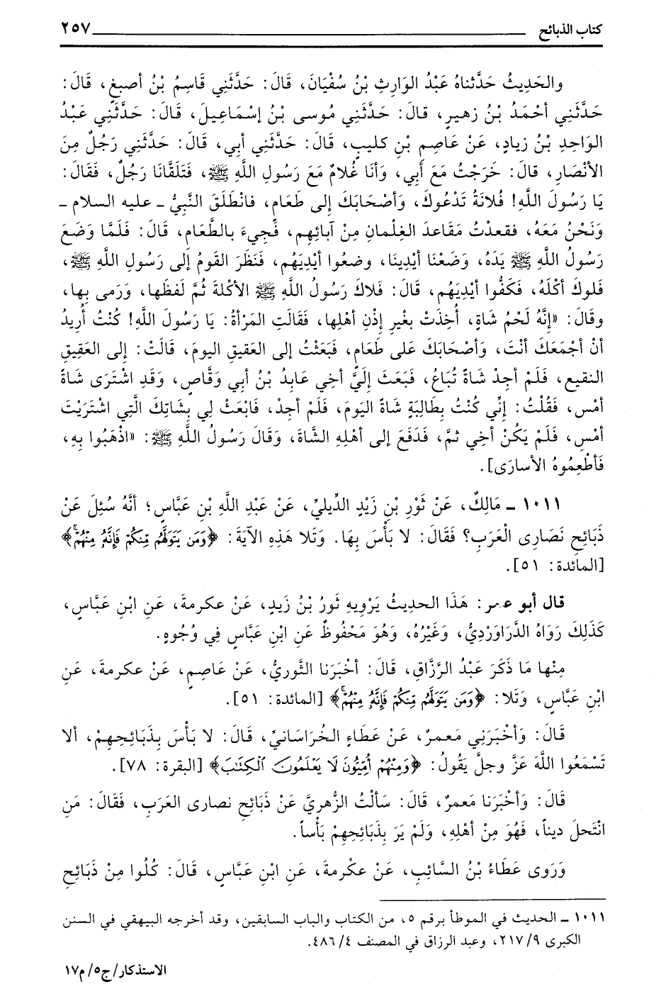 1011 - مَالِكٌ عَنْ ثَوْرِ بْنِ زَيْدٍ الدِّيلِيِّ عَنِ عَبْدِ اللَّهِ بْنِ عَبَّاسٍ أَنَّهُ سُئِلَ عَنْ ذَبَائِحِ نَصَارَى الْعَرَبِ فَقَالَ لَا بَأْسَ بِهَا وَتَلَا هَذِهِ الْآيَةَ (وَمَنْ يَتَوَلَّهُمْ مِنْكُمْ فَإِنَّهُ مِنْهُمْ) (الْمَائِدَةِ 51