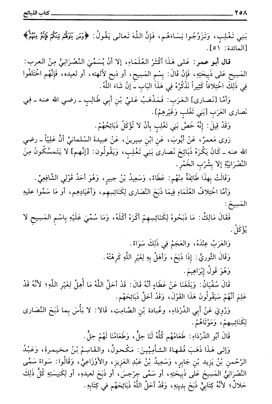 رَوَى معمر عن أيوب عن بن سِيرِينَ عَنْ عَبِيدَةَ السَّلْمَانِيِّ أَنَّ عَلِيًّا - رَضِيَ اللَّهُ عَنْهُ - كَانَ يَكْرَهُ ذَبَائِحَ نَصَارَى بَنِي تَغْلِبَ وَيَقُولُونَ إِنَّهُمْ لَا يَتَمَسَّكُونَ مِنَ النَّصْرَانِيَّةِ إِلَّا بِشُرْبِ الْخَمْرِ