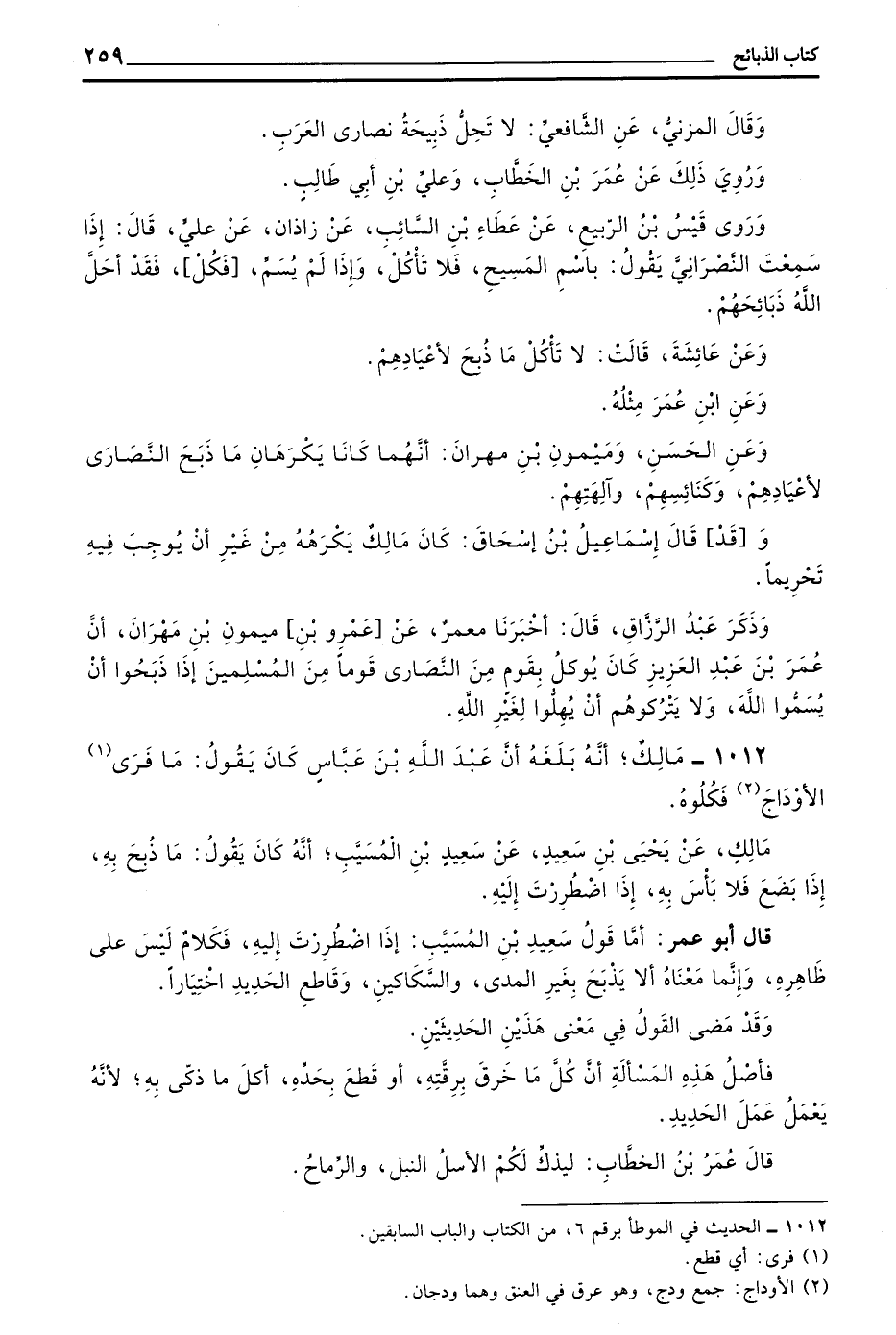 1012 - مَالِكٌ أَنَّهُ بَلَغَهُ أَنَّ عَبْدَ اللَّهِ بْنَ عَبَّاسٍ كَانَ يَقُولُ مَا فَرَى الْأَوْدَاجَ فَكُلُوهُ