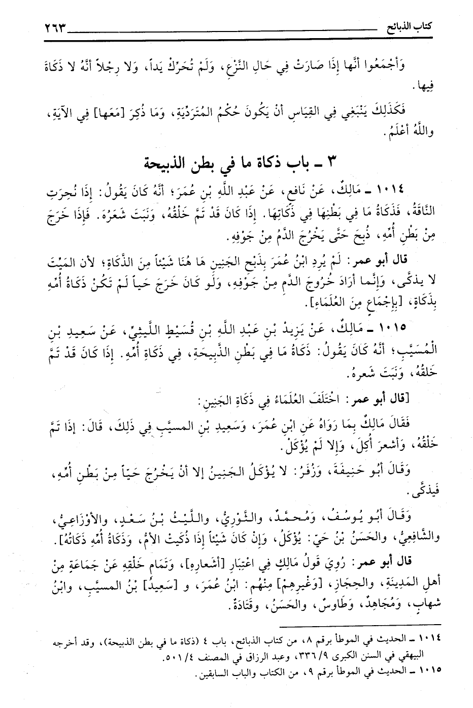 1015 - مَالِكٌ عَنْ يَزِيدَ بْنِ عَبْدِ اللَّهِ بْنِ قُسَيْطٍ اللَّيْثِيِّ عَنْ سَعِيدِ بْنِ الْمُسَيَّبِ أَنَّهُ كَانَ يَقُولُ ذَكَاةُ مَا فِي بَطْنِ الذَّبِيحَةِ فِي ذَكَاةِ أُمِّهِ إِذَا كَانَ قَدْ تَمَّ خَلْقُهُ وَنَبَتَ شَعْرُهُ