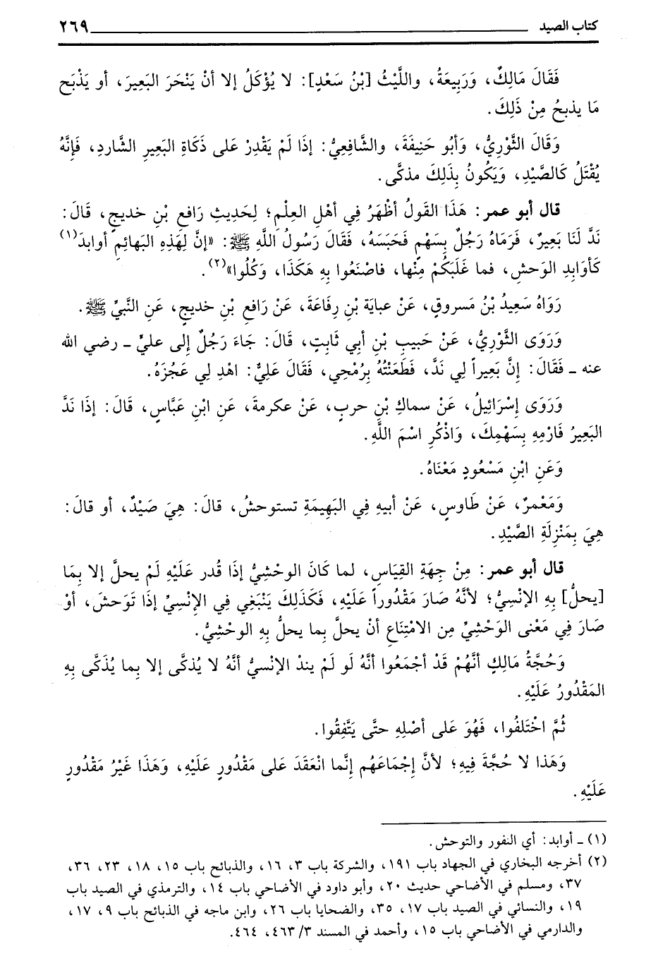قَالَ أَبُو عُمَرَ هَذَا الْقَوْلُ أَظْهَرُ فِي أَهْلِ الْعِلْمِ لِحَدِيثِ رَافِعِ بْنِ خَدِيجٍ قَالَ نَدَّ لَنَا بَعِيرٌ فَرَمَاهُ رَجُلٌ بِسَهْمٍ فَحَبَسَهُ فَقَالَ رَسُولُ اللَّهِ صَلَّى اللَّهُ عَلَيْهِ وَسَلَّمَ ((إِنَّ لِهَذِهِ الْبَهَائِمِ أَوَابِدَ (1) كَأَوَابِدِ الْوَحْشِ فَمَا غَلَبَكُمْ مِنْهَا فَاصْنَعُوا بِهِ هَكَذَا وَكُلُوا))