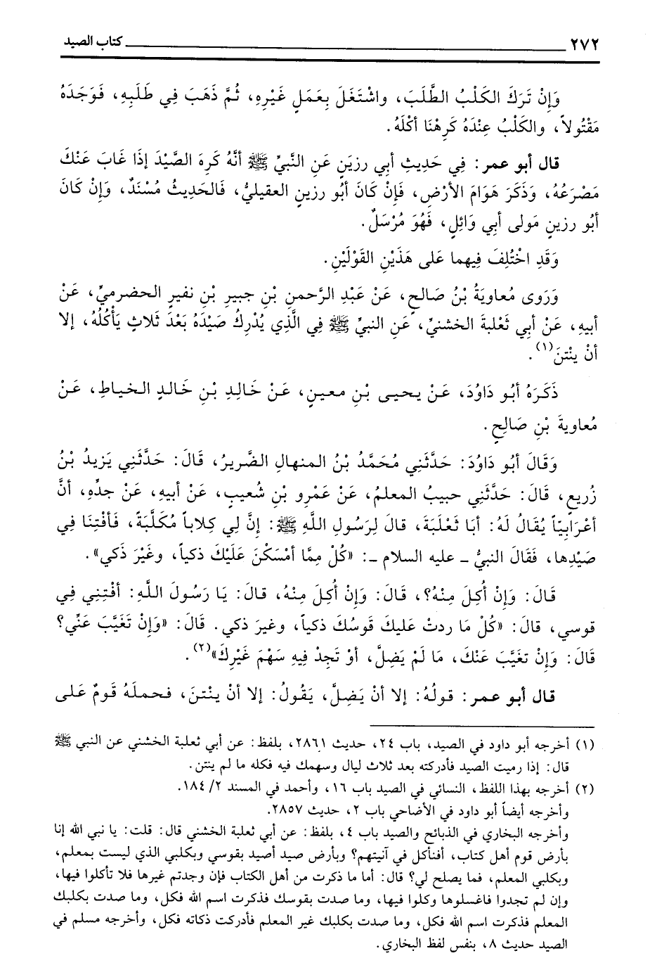 وَقَالَ أَبُو دَاوُدَ حَدَّثَنِي مُحَمَّدُ بْنُ الْمُنْهَالِ الضَّرِيرُ قَالَ حَدَّثَنِي يَزِيدُ بْنُ زُرَيْعٍ قَالَ حَدَّثَنِي حَبِيبٌ الْمُعَلِّمُ عَنْ عَمْرِو بْنِ شُعَيْبٍ عَنْ أَبِيهِ عَنْ جَدِّهِ أَنَّ أَعْرَابِيًّا يُقَالُ لَهُ أَبَا ثَعْلَبَةَ قَالَ لِرَسُولِ اللَّهِ صَلَّى اللَّهُ عَلَيْهِ وَسَلَّمَ إِنَّ لِي كِلَابًا مُكَلَّبَةً فَأَفْتِنَا فِي صَيْدِهَا فَقَالَ النَّبِيُّ - عَلَيْهِ السَّلَامُ - ((كُلْ مِمَّا أَمْسَكْنَ عَلَيْكَ ذَكِيًّا وَغَيْرَ ذَكِيٍّ))