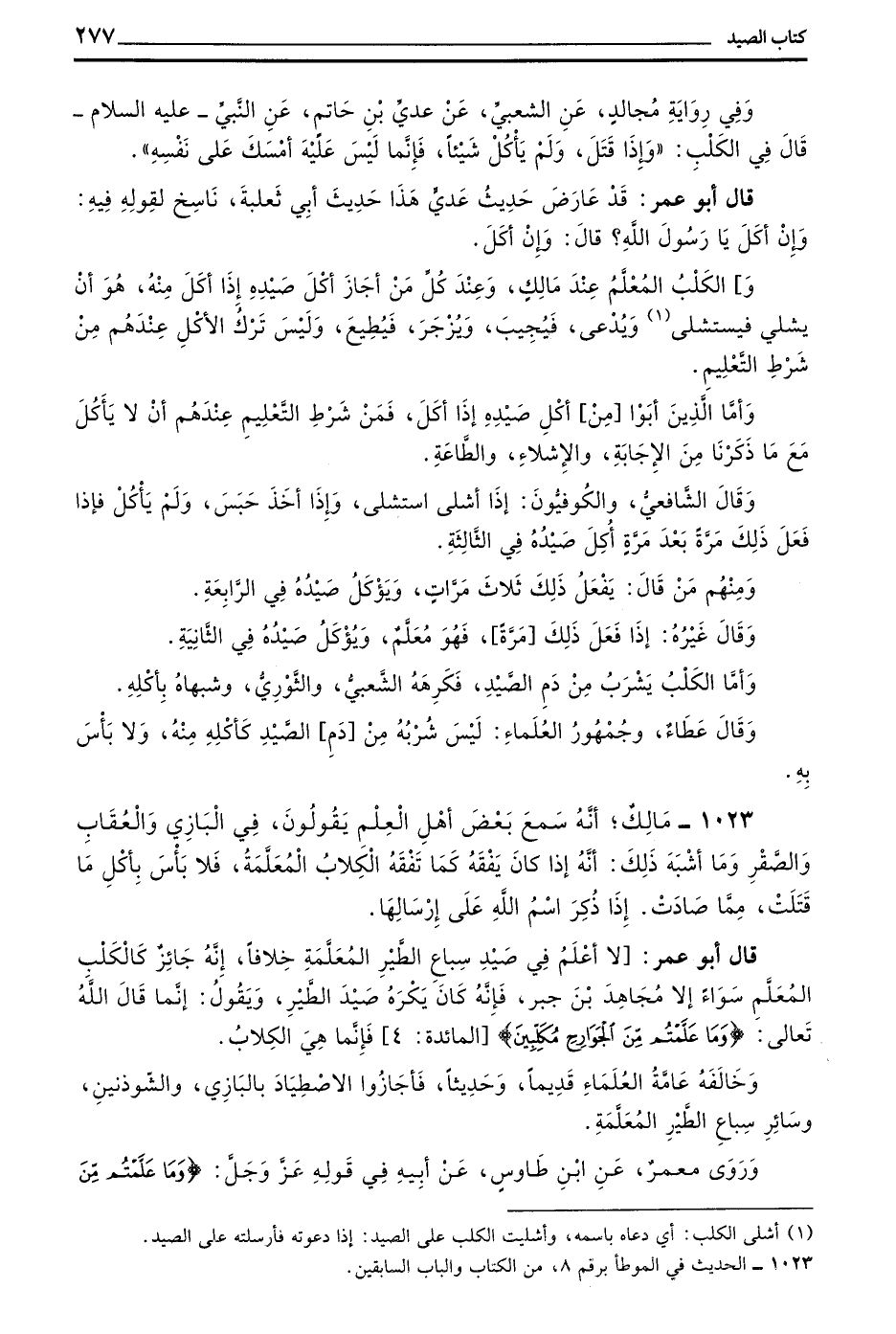 قَالَ أَبُو عُمَرَ قَدْ عَارَضَ حَدِيثُ عَدِيٍّ هَذَا حَدِيثَ أَبِي ثَعْلَبَةَ نَاسِخٌ لِقَوْلِهِ فِيهِ وَإِنْ أَكَلَ يَا رَسُولَ اللَّهِ قَالَ وَإِنْ أَكَلَ