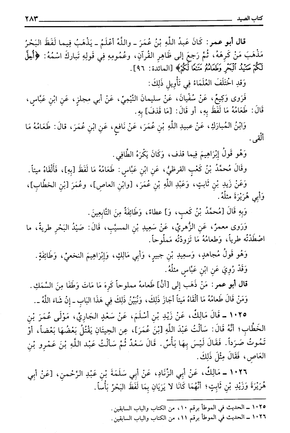 1025 - قَالَ مَالِكٌ عَنْ زَيْدِ بْنِ أَسْلَمَ عَنْ سَعْدٍ الْجَارِي مَوْلَى عُمَرَ بْنِ الْخَطَّابِ أَنَّهُ قَالَ سَأَلْتُ عَبْدَ اللَّهِ بْنَ عُمَرَ عَنْ الْحِيتَانِ يَقْتُلُ بَعْضُهَا بَعْضًا أَوْ تَمُوتُ صَرَدًا فَقَالَ لَيْسَ بِهَا بَأْسٌ قَالَ سَعْدٌ ثُمَّ سَأَلْتُ عَبْدَ اللَّهِ بْنَ عَمْرِو بْنِ الْعَاصِ فَقَالَ مِثْلَ ذَلِكَ