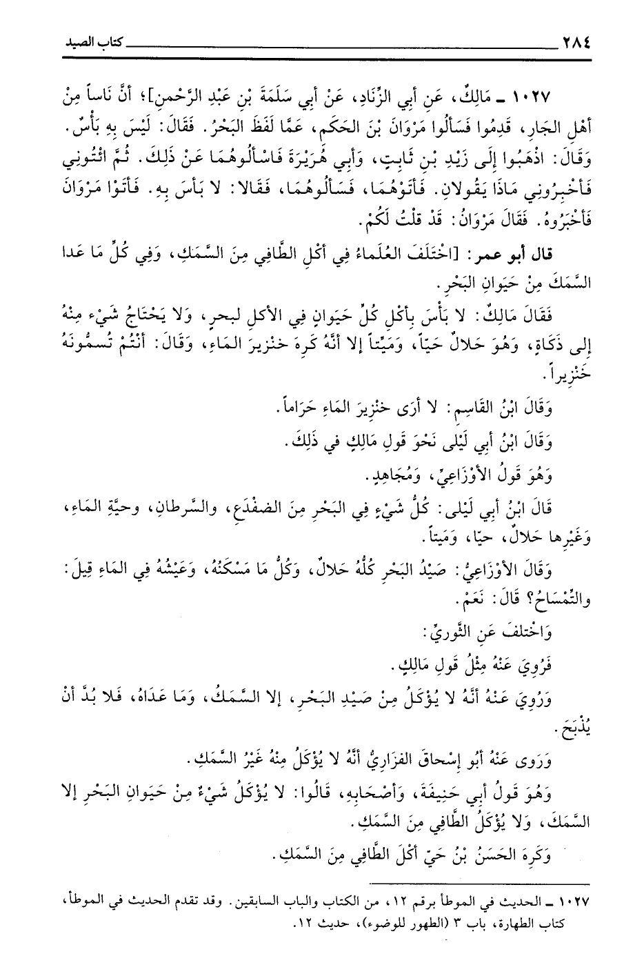 1027 - مَالِكٌ عَنْ أَبِي الزِّنَادِ عَنْ أَبِي سَلَمَةَ بْنِ عَبْدِ الرَّحْمَنِ أَنَّ نَاسًا مِنْ أَهْلِ الْجَارِ قَدِمُوا فَسَأَلُوا مَرْوَانَ بْنَ الْحَكَمِ عَمَّا لَفَظَ الْبَحْرُ فَقَالَ لَيْسَ بِهِ بَأْسٌ وَقَالَ اذْهَبُوا إِلَى زَيْدِ بْنِ ثَابِتٍ وَأَبِي هُرَيْرَةَ فَاسْأَلُوهُمَا عَنْ ذَلِكَ ثُمَّ ائْتُونِي فَأَخْبِرُونِي مَاذَا يَقُولَانِ فَأَتَوْهُمَا فَسَأَلُوهُمَا فَقَالَا لَا بَأْسَ بِهِ فَأَتَوْا مَرْوَانَ فَأَخْبَرُوهُ فَقَالَ مَرْوَانُ قَدْ قُلْتُ لَكُمْ