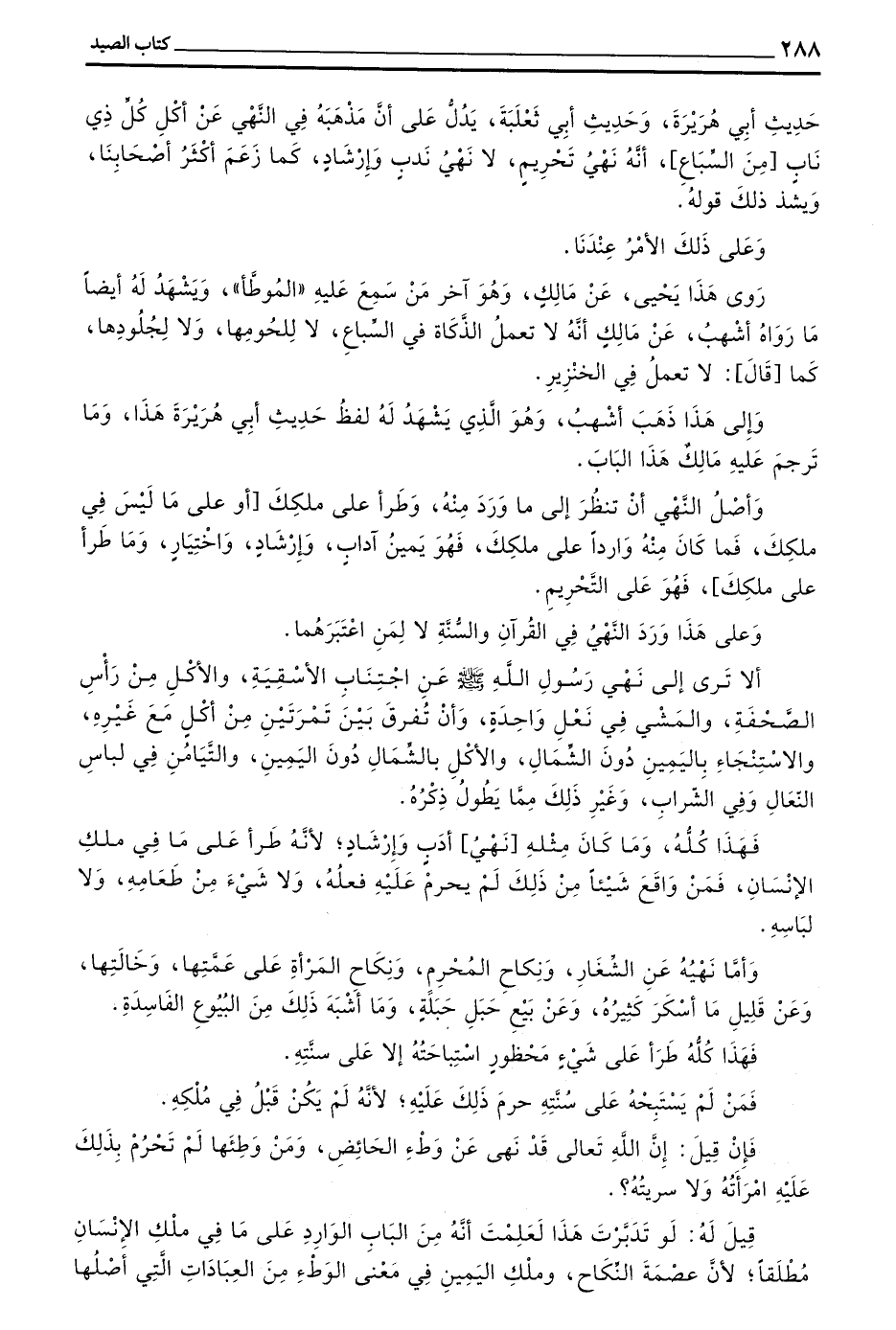 حَدِيثِ أَبِي هُرَيْرَةَ وَحَدِيثِ أَبِي ثَعْلَبَةَ يَدُلُّ عَلَى أَنَّ مَذْهَبَهُ فِي النَّهْيِ عَنْ أَكْلِ كُلِّ ذِي نَابٍ مِنَ السِّبَاعِ أَنَّهُ نَهْيُ تَحْرِيمٍ لَا نَهْيُ نَدْبٍ وَإِرْشَادٍ كَمَا زَعَمَ أكثر أصحابنا ويشذ ذَلِكَ قَوْلُهُ