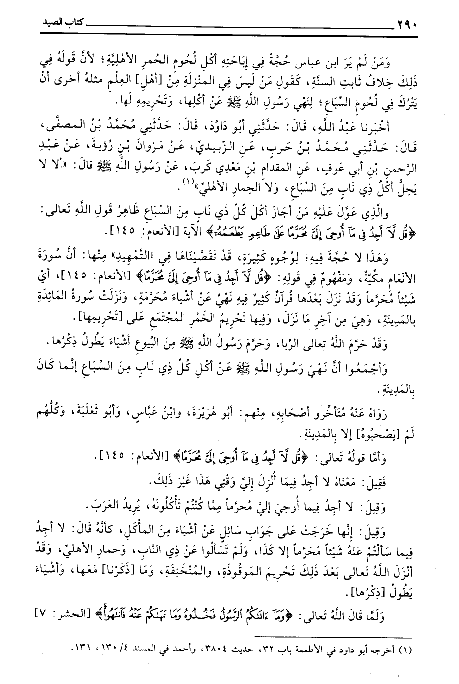 وَالَّذِي عَوَّلَ عَلَيْهِ مَنْ أَجَازَ أَكْلَ كُلِّ ذِي نَابٍ مِنَ السِّبَاعِ ظَاهِرُ قَوْلِ اللَّهِ تَعَالَى (قُلْ لَا أَجِدُ فِي مَا أُوحِيَ إِلَيَّ مُحَرَّمًا عَلَى طَاعِمٍ يَطْعَمُهُ) الْآيَةَ الْأَنْعَامِ 145