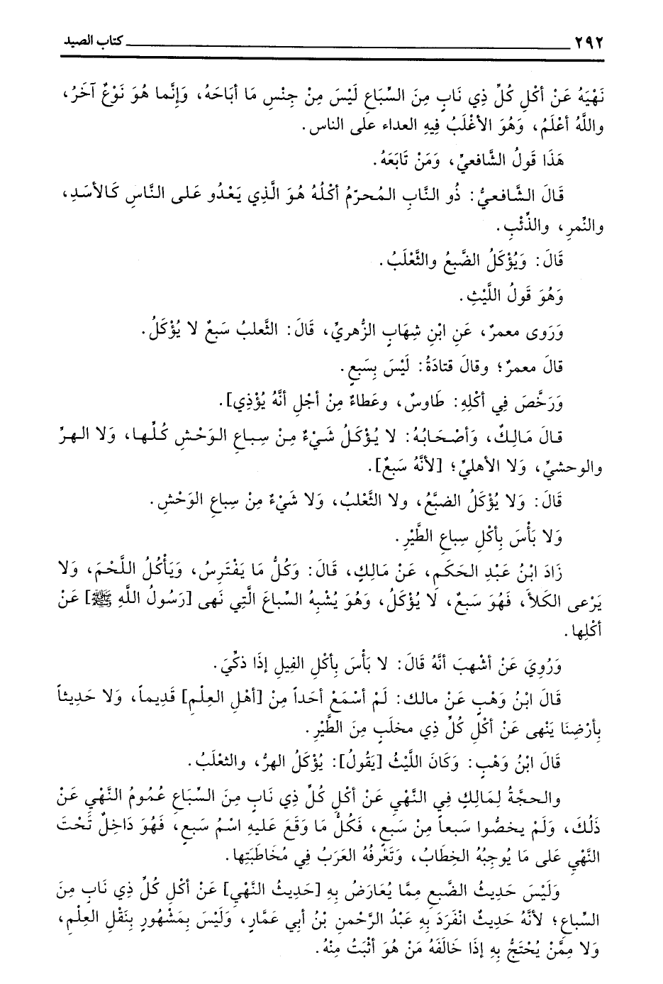 وَالْحُجَّةُ لِمَالِكٍ فِي النَّهْيِ عَنْ أَكْلِ كُلِّ ذِي نَابٍ مِنَ السِّبَاعِ عُمُومُ النَّهْيِ عَنْ ذَلِكَ وَلَمْ يَخُصُّوا سَبُعًا مِنْ سَبُعٍ فَكُلُّ مَا وَقَعَ عَلَيْهِ اسْمُ سَبُعٌ فَهُوَ دَاخِلٌ تَحْتَ النَّهْيِ عَلَى مَا يُوجِبُهُ الْخِطَابُ وَتَعْرِفُهُ الْعَرَبُ فِي مُخَاطَبَتِهَا