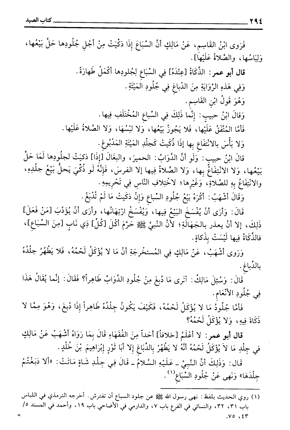 فروى بن الْقَاسِمِ عَنْ مَالِكٍ أَنَّ السِّبَاعَ إِذَا ذَكِّيَتْ مِنْ أَجْلِ جُلُودِهَا حَلَّ بَيْعُهَا وَلِبَاسُهَا وَالصَّلَاةُ عَلَيْهَا