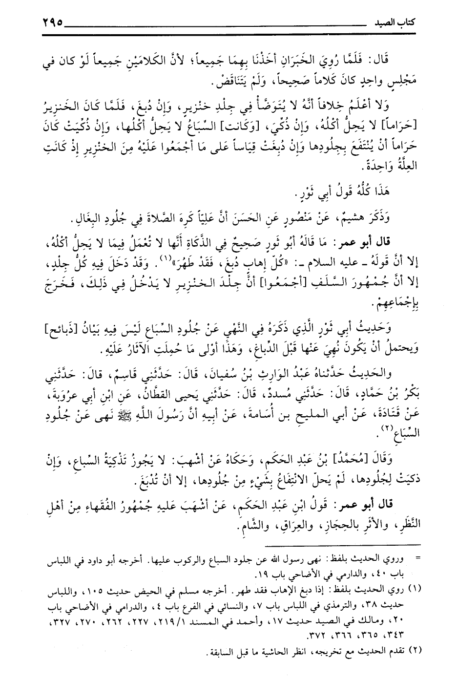 وحديث أبي ثَوْرٍ الَّذِي ذَكَرَهُ فِي النَّهْيِ عَنْ جُلُودِ السِّبَاعِ لَيْسَ فِيهِ بَيَانُ ذَبَائِحَ وَيُحْتَمَلُ أَنْ يَكُونَ نَهَى عَنْهَا قَبْلَ الدِّبَاغِ وَهَذَا أَوْلَى مَا حُمِلَتِ الْآثَارُ عَلَيْهِ