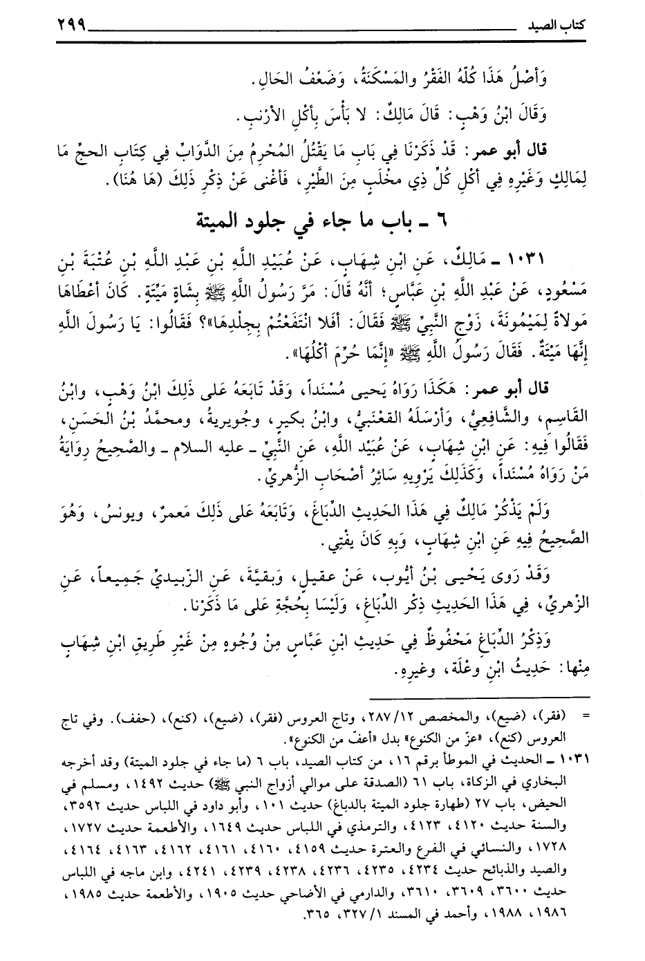 1031 - مالك عن بن شِهَابٍ عَنْ عُبَيْدِ اللَّهِ بْنِ عَبْدِ اللَّهِ بْنِ عُتْبَةَ بْنِ مَسْعُودٍ عَنْ عَبْدِ اللَّهِ بْنِ عَبَّاسٍ أَنَّهُ قَالَ مَرَّ رَسُولُ اللَّهِ صَلَّى اللَّهُ عَلَيْهِ وَسَلَّمَ بِشَاةٍ مَيِّتَةٍ كَانَ أَعْطَاهَا مَوْلَاهُ لِمَيْمُونَةَ زَوْجَ النَّبِيِّ صَلَّى اللَّهُ عَلَيْهِ وَسَلَّمَ فَقَالَ أَفَلَا انْتَفَعْتُمْ بِجِلْدِهَا)) فَقَالُوا يَا رَسُولَ اللَّهِ إِنَّهَا مَيْتَةٌ فَقَالَ رَسُولُ اللَّهِ صَلَّى اللَّهُ عَلَيْهِ وَسَلَّمَ ((إِنَّمَا حُرِّمَ أَكْلُهَا))