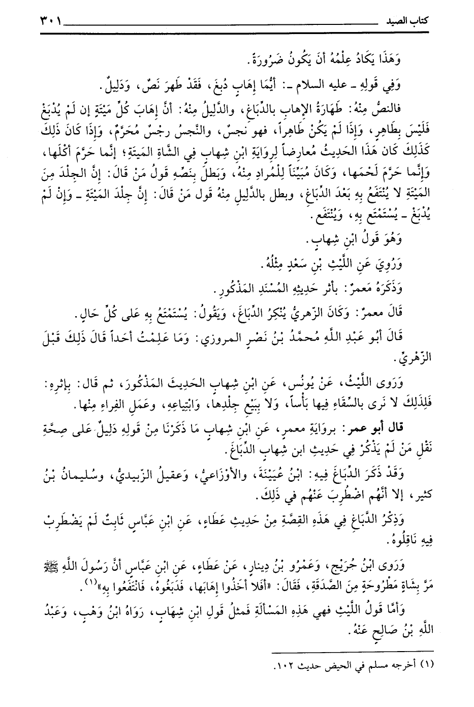 فَالنَّصُّ مِنْهُ طَهَارَةُ الْإِهَابِ بِالدِّبَاغِ وَالدَّلِيلُ مِنْهُ أَنَّ إِهَابَ كُلِّ مَيْتَةٌ إِنْ لَمْ يُدْبَغْ فَلَيْسَ بِطَاهِرٍ وَإِذَا لَمْ يَكُنْ طَاهِرًا فَهُوَ نَجِسٌ وَالنَّجِسُ رِجْسٌ مُحَرَّمٌ وَإِذَا كان ذلك كذلك كان هذا الحديث معارضا لرواية بن شِهَابٍ فِي الشَّاةِ الْمَيْتَةِ إِنَّمَا حَرَّمَ أَكْلَهَا وَإِنَّمَا حَرَّمَ لَحْمَهَا وَكَانَ مُبَيِّنًا لِلْمُرَادِ مِنْهُ وَبَطَلَ بِنَصِّهِ قَوْلُ مَنْ قَالَ إِنَّ الْجِلْدَ مِنَ الْمَيْتَةِ لَا يُنْتَفَعُ بِهِ بَعْدَ الدِّبَاغِ وَبَطَلَ بِالدَّلِيلِ مِنْهُ قَوْلُ مَنْ قَالَ إِنَّ جِلْدَ الْمَيْتَةِ - وَإِنْ لَمْ يُدْبَغْ - يُسْتَمْتَعْ بِهِ وينتفع