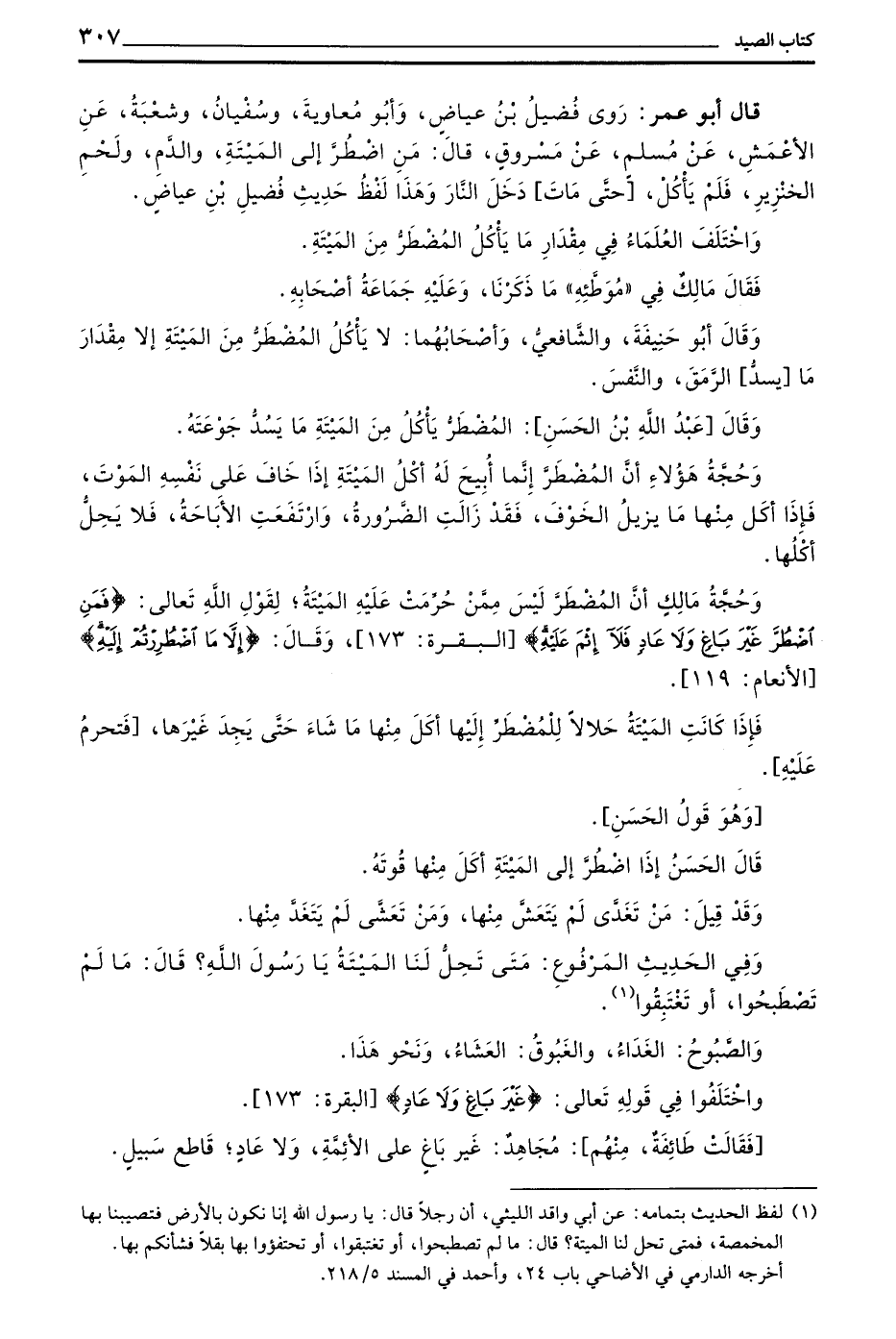 وَحُجَّةُ مَالِكٍ أَنَّ الْمُضْطَرَّ لَيْسَ مِمَّنْ حُرِّمَتْ عَلَيْهِ الْمَيْتَةُ لِقَوْلِ اللَّهِ تَعَالَى (فَمَنِ اضْطُرَّ غَيْرَ بَاغٍ وَلَا عَادٍ فَلَا إِثْمَ عَلَيْهِ) الْبَقَرَةِ 173 وَقَالَ (إِلَّا مَا اضْطُرِرْتُمْ إِلَيْهِ) الْأَنْعَامِ 119
